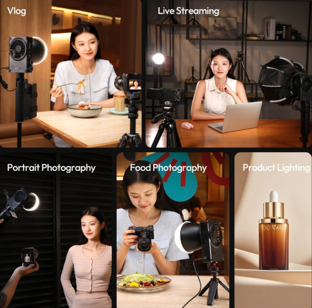 Su diseño de cuerpo hueco y ventilador de alta velocidad está pensado para un uso continuo y garantiza una refrigeración eficaz que mantiene la luz estable y evita el sobrecalentamiento durante largas sesiones de rodaje. El modelo C01 es compatible con los soportes Mini Bowens y se puede utilizar con reflectores, softboxes y modificadores de luz que amplían tus posibilidades creativas.