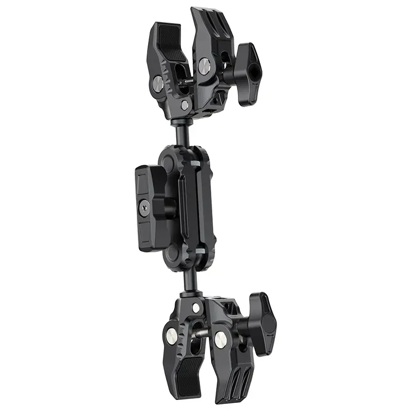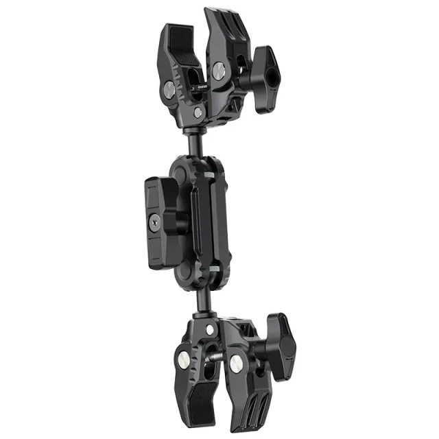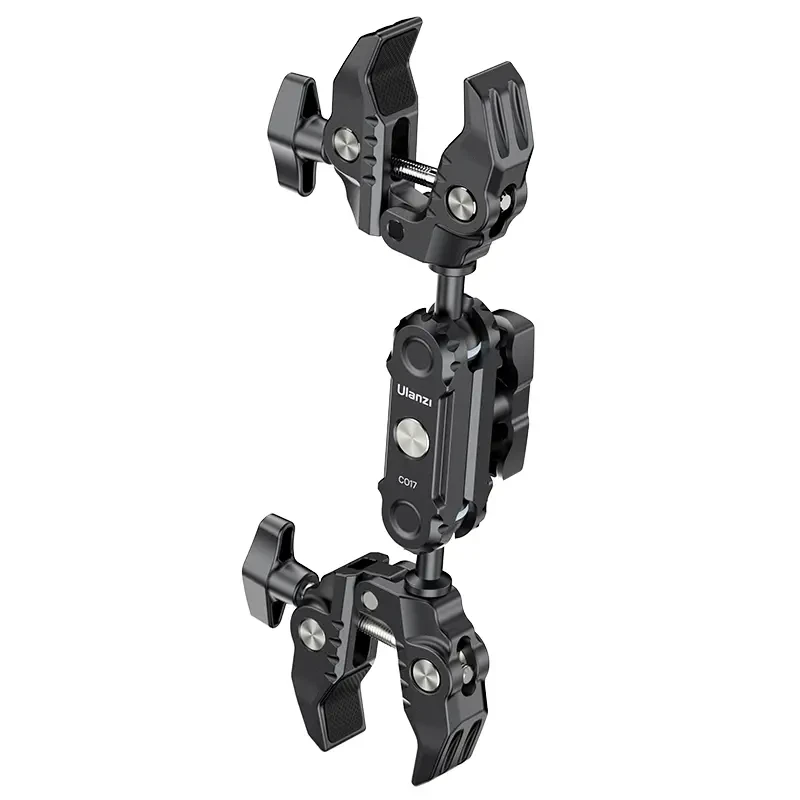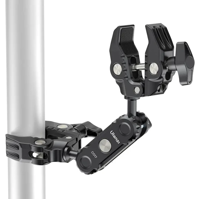 Ulanzi CO17 Super Clamp con rótula doble Magic Arm. Esta pinza universal se fija fácilmente a motocicletas, bicicletas, trípodes, mesas y otros objetos. Su diseño antideslizante garantiza una sujeción segura en superficies con un ancho de entre 1,2 cm y 5,8 cm. La doble rótula ofrece un ajuste flexible en un rango de 360°, lo que permite ángulos de giro versátiles. Las rótulas son intercambiables, lo que amplía las posibilidades de uso, con una capacidad de carga de 3,5 kg. Está fabricada en una aleación de aluminio ligera pero resistente y es ideal tanto para viajar como para el uso diario. Super Clamp para una flexibilidad extraordinaria.