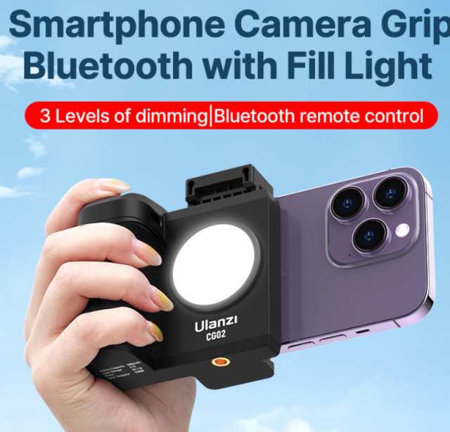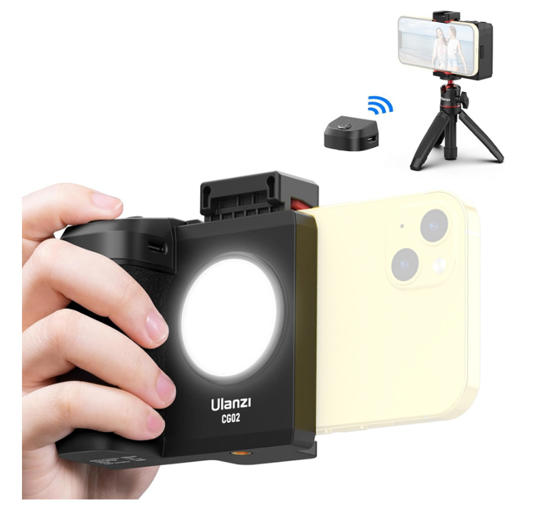 El soporte para cámara de smartphone Ulanzi CG-02 es un soporte de mano universal con luz auxiliar integrada y control remoto por Bluetooth. Está diseñado para fotografiar con una sola mano y mejora la estabilidad, la iluminación y el control, lo que lo hace ideal para vlogs, retransmisiones en directo y fotografía móvil.
