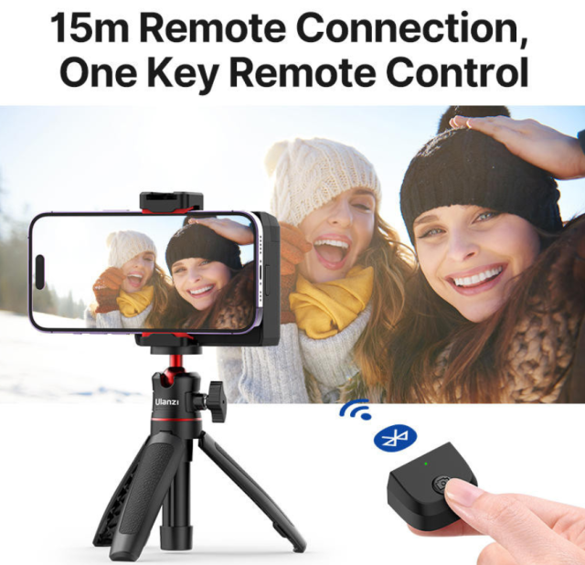 Para mayor comodidad, el soporte está equipado con un mando a distancia Bluetooth extraíble con un alcance inalámbrico de hasta 15 metros. Se conecta al instante a la mayoría de los smartphones sin necesidad de descargar aplicaciones, lo que facilita tomar fotos o iniciar la grabación de forma remota. El mango ergonómico con superficie de silicona suave proporciona mayor estabilidad y resistencia a las vibraciones, a la vez que resulta cómodo incluso durante un uso prolongado con una sola mano.