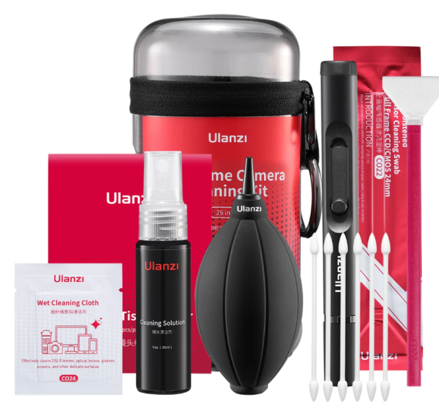 El kit de limpieza para cámaras Ulanzi CO28 26 en 1 es una solución completa para limpiar cámaras de formato completo y ópticas de precisión. Incluye 26 herramientas imprescindibles en un estuche compacto y elimina de forma segura el polvo, las huellas dactilares, las marcas y las manchas de agua, por lo que es ideal para fotógrafos y creadores que viajan.