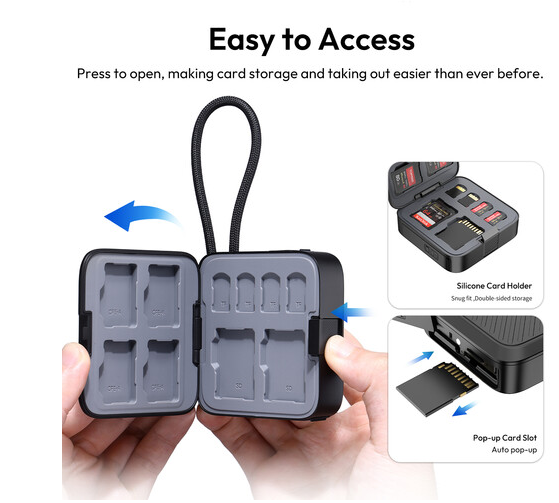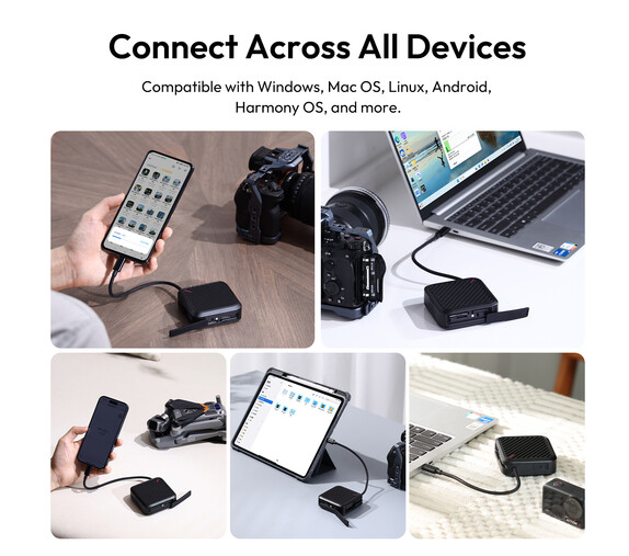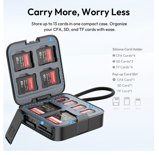 El estuche para lector de tarjetas Ulanzi CRC10 3 en 1 es una solución potente y portátil para creadores que necesitan una transferencia rápida de datos y un almacenamiento organizado de sus soportes. Está diseñado para funcionar tanto como lector de tarjetas como estuche de almacenamiento de datos, y admite tarjetas CFexpress Tipo A, SD y microSD simultáneamente a través de tres ranuras dedicadas para el lector. Además, ofrece un amplio espacio de almacenamiento con cuatro ranuras CFexpress Tipo A, dos ranuras SD y cuatro ranuras microSD, lo que te permite guardar hasta 13 tarjetas en una sola unidad compacta. El cable USB-C 3.2 Gen 2 integrado proporciona una velocidad de transferencia de datos de hasta 10 Gb/s, lo que permite realizar copias de seguridad rápidas y flujos de trabajo eficientes sin necesidad de utilizar adaptadores. La carcasa exterior de aluminio aumenta la resistencia y la disipación del calor, mientras que el revestimiento interior de silicona protege las tarjetas contra los golpes. Gracias a su apertura mediante botón, al indicador LED de estado, a su amplia compatibilidad con sistemas operativos y a la correa integrada para un transporte fácil, el CRC10 es el compañero ideal para fotógrafos, videógrafos y profesionales móviles.