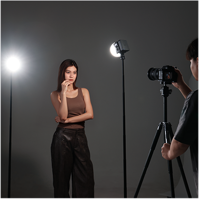 Ulanzi EC65 LED video light used in video shooting setup, woman posing.