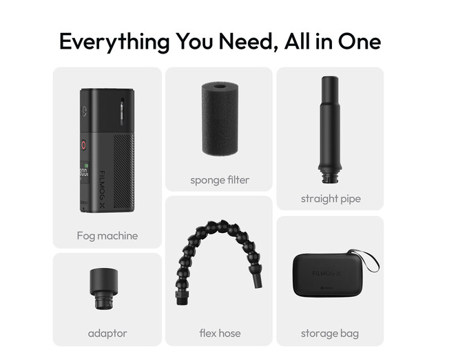 La máquina de humo, diseñada pensando en los creadores, incluye orificios de fijación de 1/4"-20 y ARRI para un montaje sencillo en rigs, trípodes o jaulas. El kit se suministra con líquido de niebla inodoro y apto para uso alimentario (certificado MSDS y RoHS), las herramientas necesarias y una bolsa de transporte protectora, por lo que está listo para usar nada más desembalarlo.