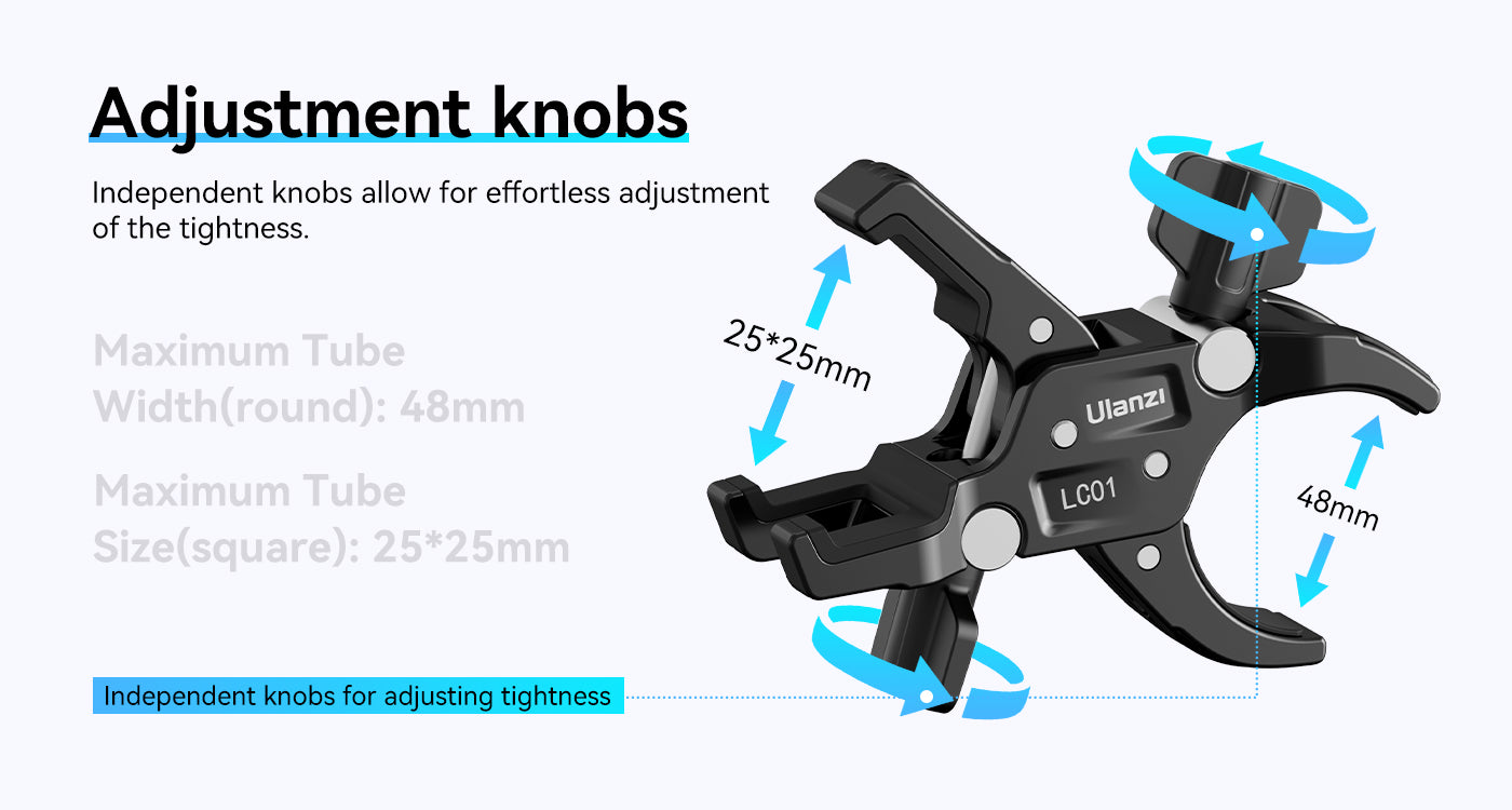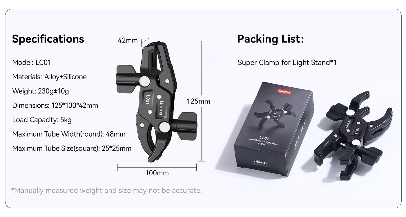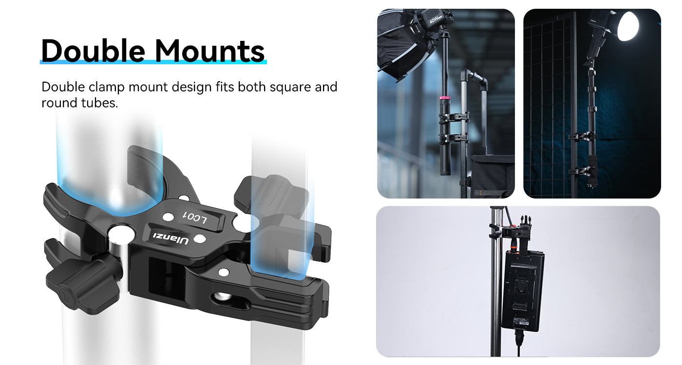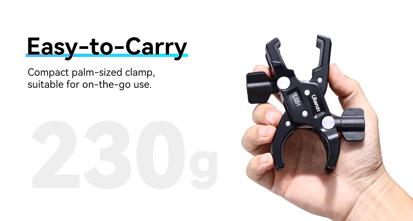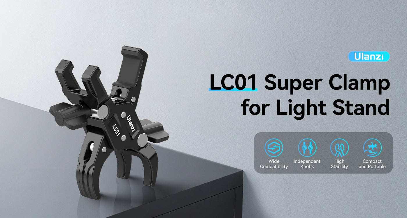 El soporte Ulanzi LC01 Super Clamp Mount es una solución compacta y resistente para fijar equipos a soportes de iluminación, trípodes o estructuras de rigging. Gracias a sus abrazaderas dobles, aptas tanto para tubos redondos como cuadrados, soporta hasta 5 kg de equipo, lo que lo hace ideal para luces, cámaras o accesorios. Está fabricado en una aleación resistente y silicona de alta adherencia, lo que garantiza una estabilidad firme. El LC01 es ideal tanto para creadores móviles como para profesionales de estudio, y ofrece un control preciso y portabilidad en un único dispositivo potente del tamaño de la palma de la mano.