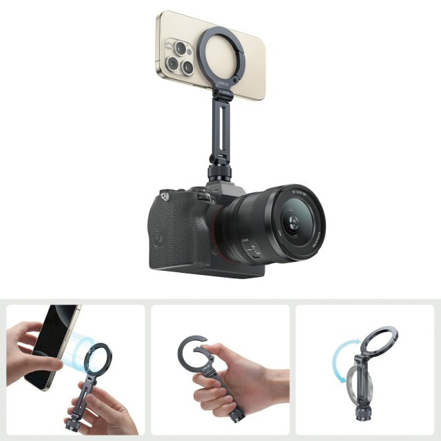 El soporte Ulanzi MA07 MagLock 1/4 Cold Shoe es un soporte plegable y universal para teléfonos y accesorios con fijación MagSafe de una sola mano, giro e inclinación continuos y compatibilidad universal con roscas de 1/4"-20 y cold shoe. Compacto, ligero y listo para viajar, es ideal para retransmisiones en directo, entrevistas, grabaciones en dos pantallas y configuraciones móviles creativas.