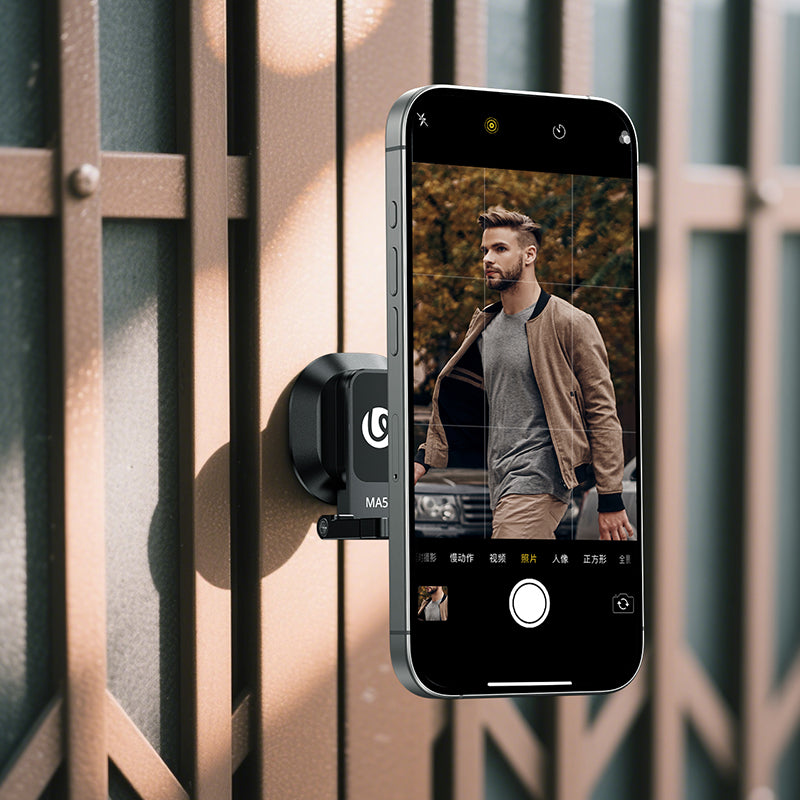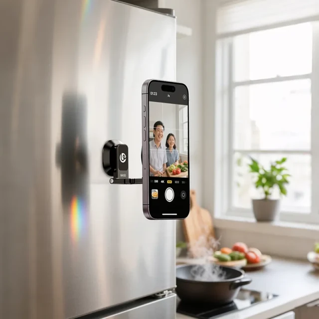 Desde la barandilla hasta la puerta de la nevera, la base magnética se adhiere a superficies metálicas, para que puedas capturar ángulos que otros pasan por alto.