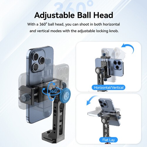 El soporte para teléfono Ulanzi MA53 Ball Head Phone Mount ofrece flexibilidad y estabilidad profesionales para los creadores de contenido en smartphones. Este soporte está fabricado en aluminio resistente y, gracias a sus mordazas de silicona, que protegen tu dispositivo de arañazos y movimientos involuntarios, sujeta con seguridad smartphones de entre 2,4 y 3,7 pulgadas de ancho.