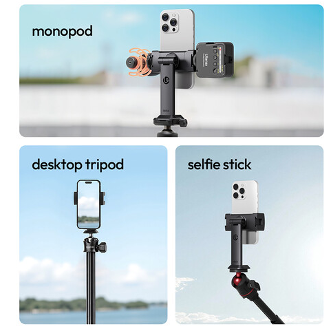 El soporte para móvil Ulanzi MA54 Uka es una solución compacta y fiable para creadores de contenido, vlogueros y cineastas móviles. Está equipado con una base Uka de fijación rápida integrada, que permite acoplarlo fácilmente a trípodes y monopiés Uka compatibles, mientras que la rosca interna de 1/4"-20 amplía la compatibilidad con soportes y accesorios estándar. La abrazadera con resorte sujeta de forma segura smartphones de 60 a 105 mm de ancho y está equipada con mordazas de silicona que protegen el dispositivo y mejoran la adherencia. Para una máxima flexibilidad, el soporte admite un giro de 360° y una inclinación de 180°, lo que permite cambiar fácilmente entre la orientación vertical y horizontal. Dos soportes integrados para zapas frías facilitan la fijación de micrófonos, luces LED u otros accesorios, lo que convierte al MA54 en una práctica solución todo en uno para la creación de contenido móvil.