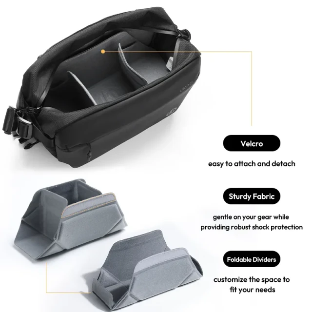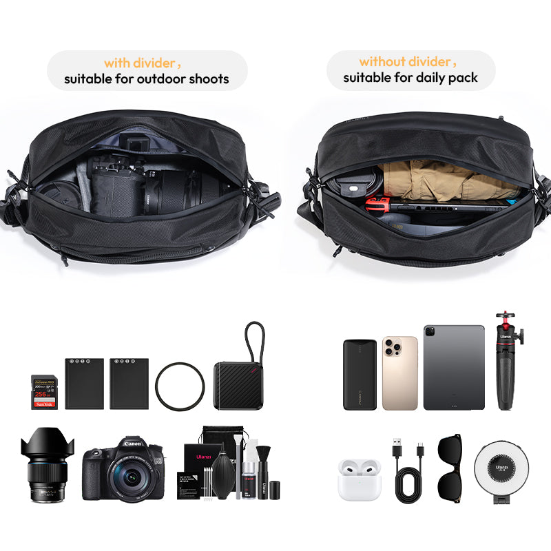 La bolsa para cámara Ulanzi B120 ofrece 10 litros de espacio de almacenamiento organizado para fotógrafos y viajeros. Está fabricada con tejido resistente al agua y cremalleras duraderas, por lo que protege tu equipo en cualquier condición meteorológica. Gracias a sus múltiples compartimentos, el estuche para tableta y la separadora extraíble, puedes alternar fácilmente entre la fotografía y el uso diario. Esta ligera bandolera con correa inferior ajustable para trípodes es ideal para fotografiar en la ciudad, hacer senderismo o escapadas de fin de semana.