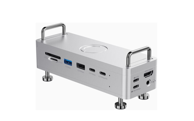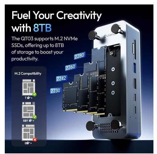 La estación de acoplamiento Ulanzi A050 QT03 es una estación de acoplamiento USB4 universal y de alta velocidad con una bahía para SSD M.2 NVMe, que ofrece hasta 8 TB de espacio de almacenamiento adicional. Admite velocidades de transferencia de 40 Gb/s, cuenta con salida de vídeo HDMI 4K60, varios puertos USB, ranuras para tarjetas SD/microSD y un puerto de audio de 3,5 mm. Gracias al ventilador integrado y a su carcasa de aluminio, garantiza una refrigeración y un rendimiento óptimos en sistemas macOS, Windows, Linux y Android.
