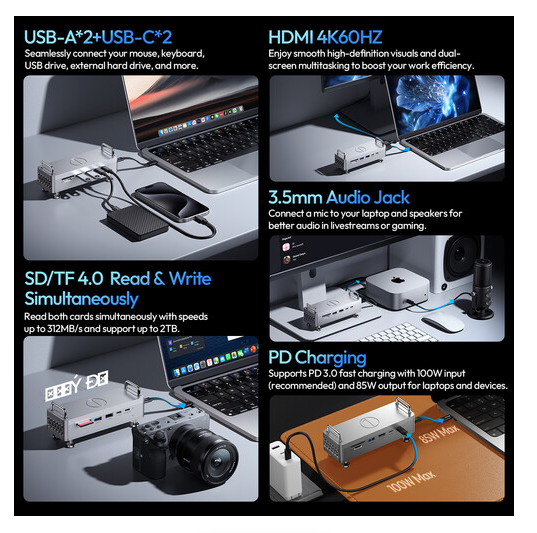 La conectividad se ve mejorada aún más con varios puertos USB, incluido un puerto USB-C PD que admite una alimentación de hasta 80 W, un puerto USB-A con una velocidad de 10 Gb/s y una ranura para tarjetas microSD/SD que permite un acceso rápido a los archivos multimedia. La estructura de aluminio de la estación de acoplamiento y el ventilador ajustable, integrado en un diseño de rejilla de ventilación, ayudan a mantener una temperatura óptima y reducen la acumulación de calor. Es totalmente compatible con macOS, Windows, Linux y Android, lo que la hace ideal para usuarios de diferentes plataformas. Gracias a sus fiables chips (ASM2464PD y VL822-07T), la Ulanzi A050 garantiza la estabilidad y la protección de los datos mediante una protección integrada contra sobrecorriente y cortocircuitos.