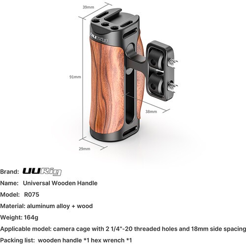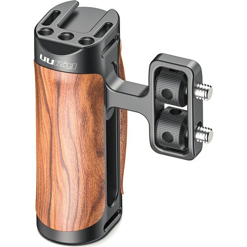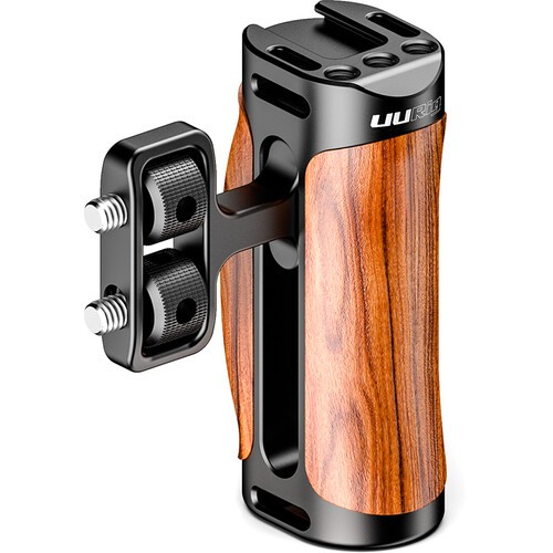 La empuñadura universal de madera Ulanzi R075 Left/Right combina madera de palisandro brasileño de primera calidad con aluminio aeronáutico y ofrece un agarre cómodo y seguro, con opciones de fijación universales para jaulas de cámara.
