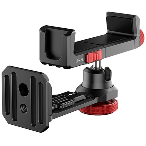 El soporte es compatible tanto con el sistema de fijación rápida tipo Arca como con la conexión roscada estándar de 1/4"-20, lo que permite fijarlo fácilmente a trípodes, monopiés, palos selfies, empuñaduras y rigs de cámara. La rótula integrada permite un giro de 360° y un ajuste continuo de la inclinación, lo que te ofrece total libertad a la hora de cambiar entre la orientación vertical y horizontal o de ajustar ángulos de disparo precisos.