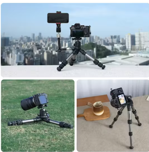 Las patas con bloqueo giratorio ofrecen una altura ajustable de forma continua de 140 mm a 440 mm, y el mecanismo de ajuste rápido del ángulo permite configurar fácilmente ángulos bajos. Está fabricado en aluminio grueso, soporta hasta 20 kg y las patas de goma antideslizantes extraíbles garantizan la estabilidad en cualquier superficie. El soporte lateral integrado de 1/4 pulgadas permite acoplar accesorios como un soporte para smartphone, una luz LED o un brazo articulado, lo que aumenta la versatilidad para diferentes situaciones fotográficas.