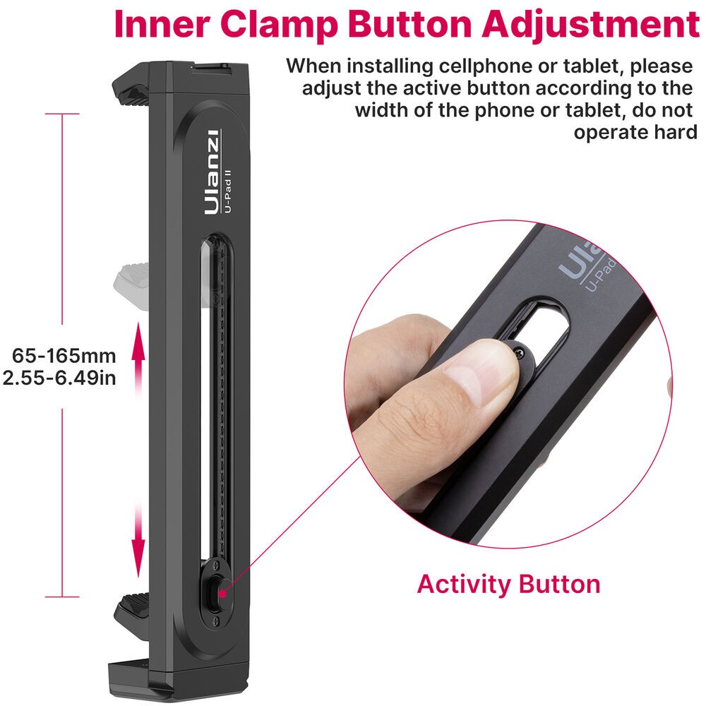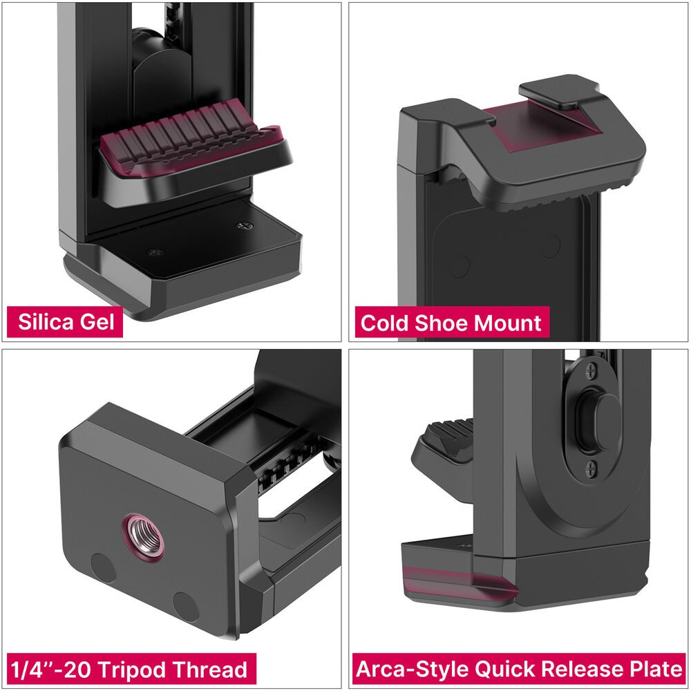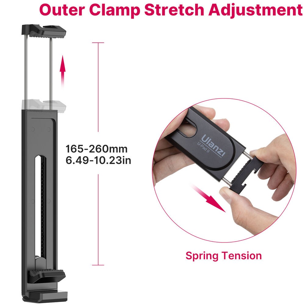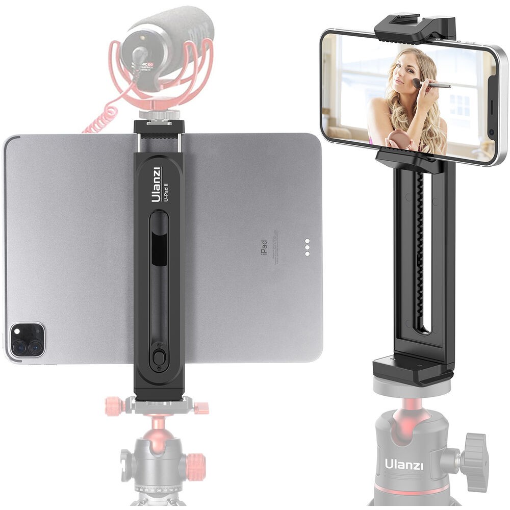 El Ulanzi U-Pad II es una pinzauniversal para trípode que sujeta con seguridad smartphones o tabletas con un ancho de entre 2,6 y 10,2 pulgadas. Está equipado con pinzas de botón y de resorte, fijaciones de 1/4" y tipo Arca, y una base superior para accesorios.