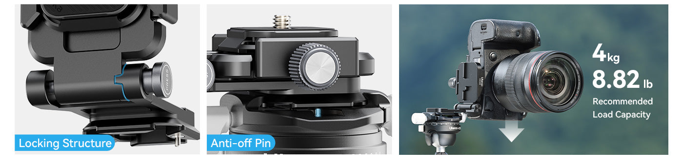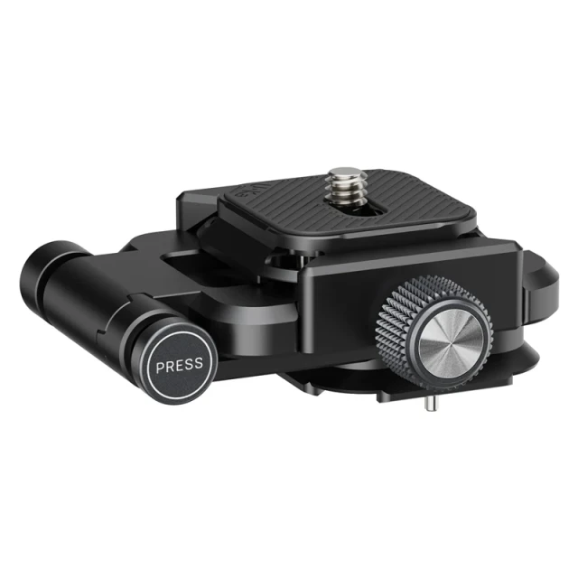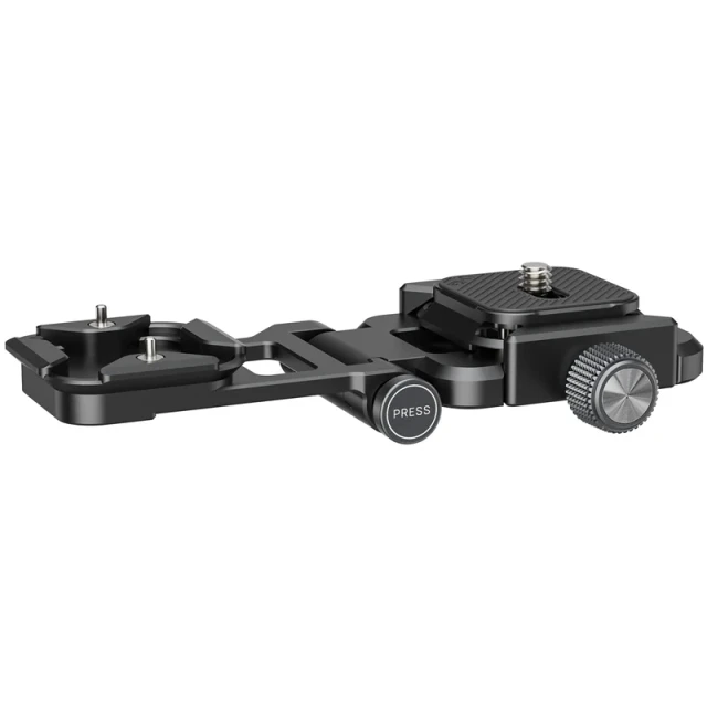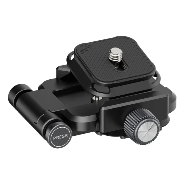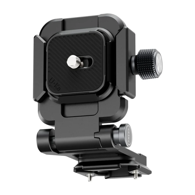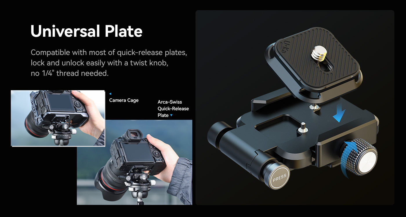 Placa universal. Compatible con la mayoría de placas de fijación rápida. Fácil de bloquear y desbloquear mediante un botón giratorio. No requiere rosca de 1/4".