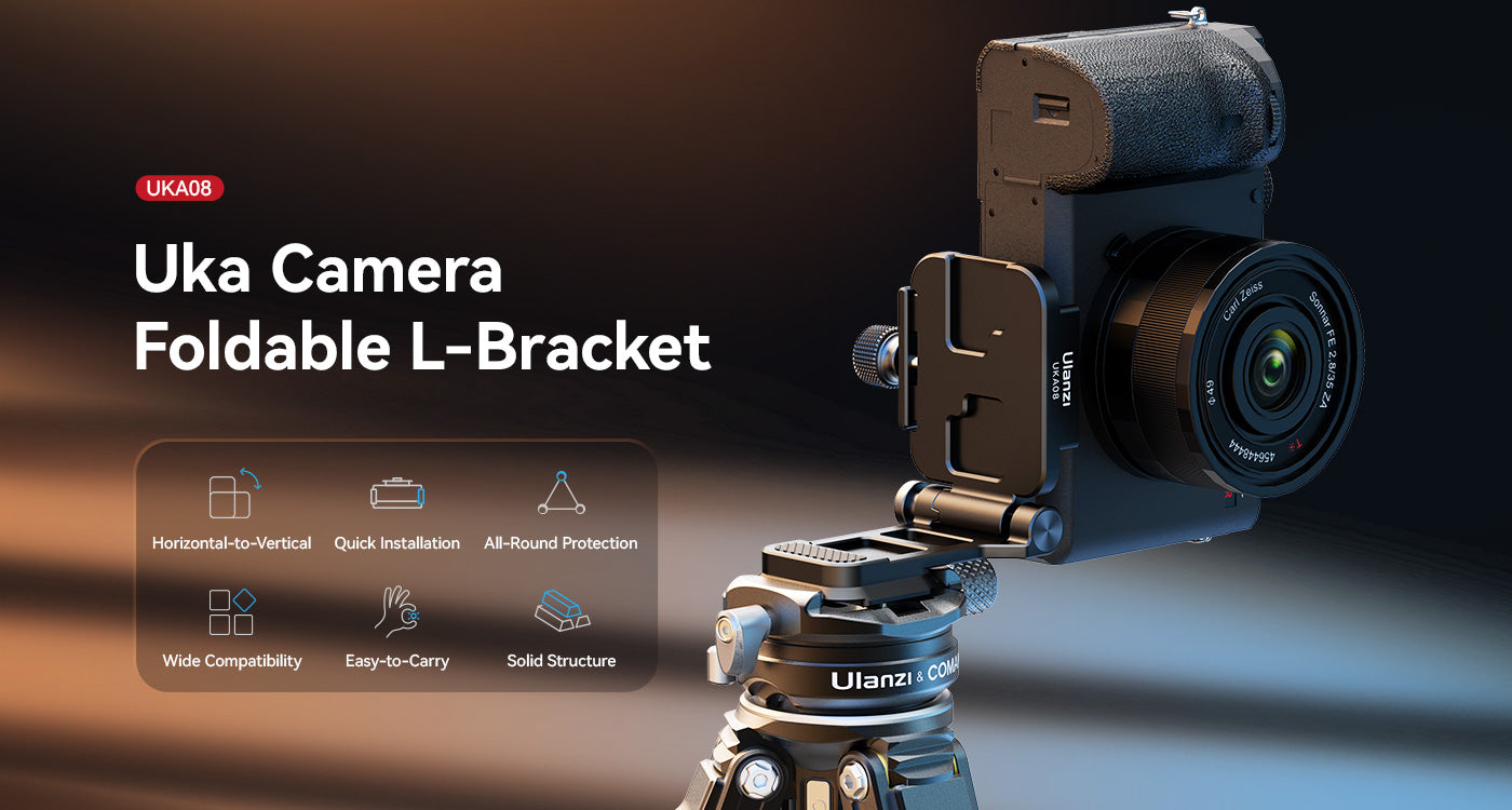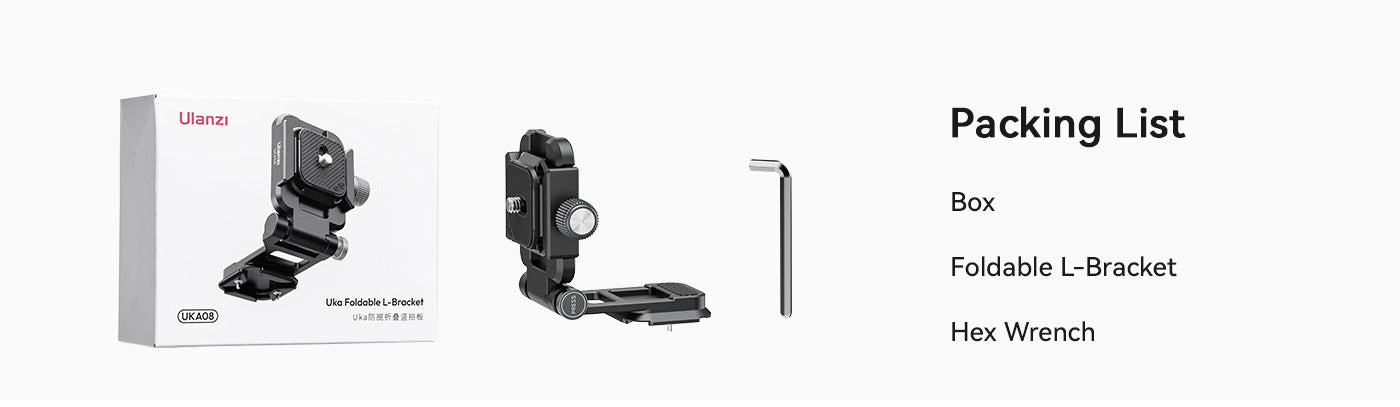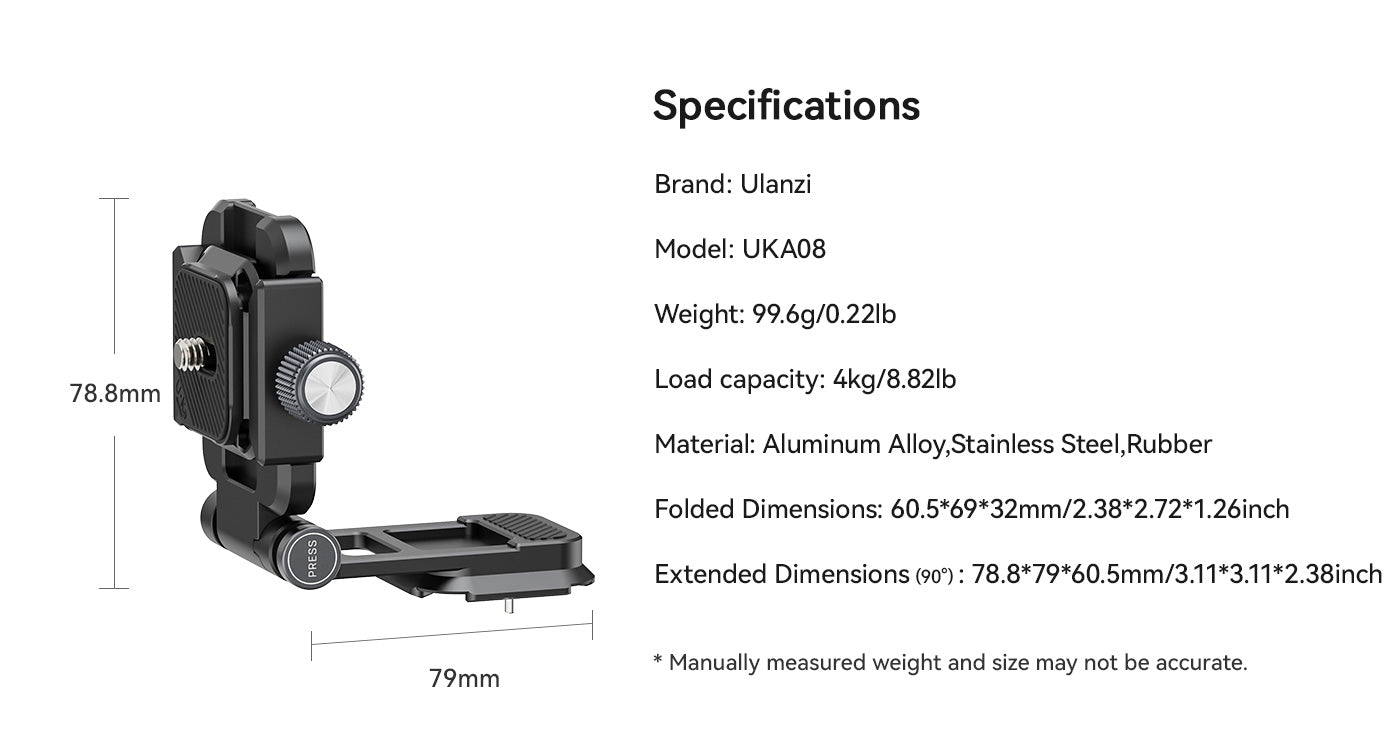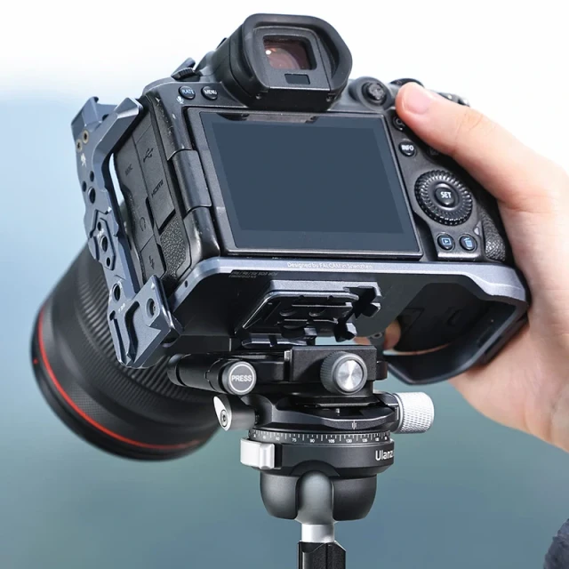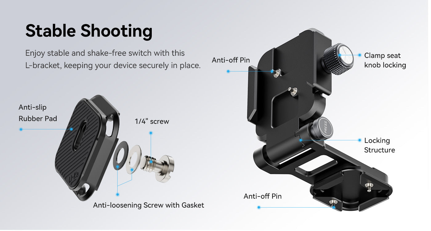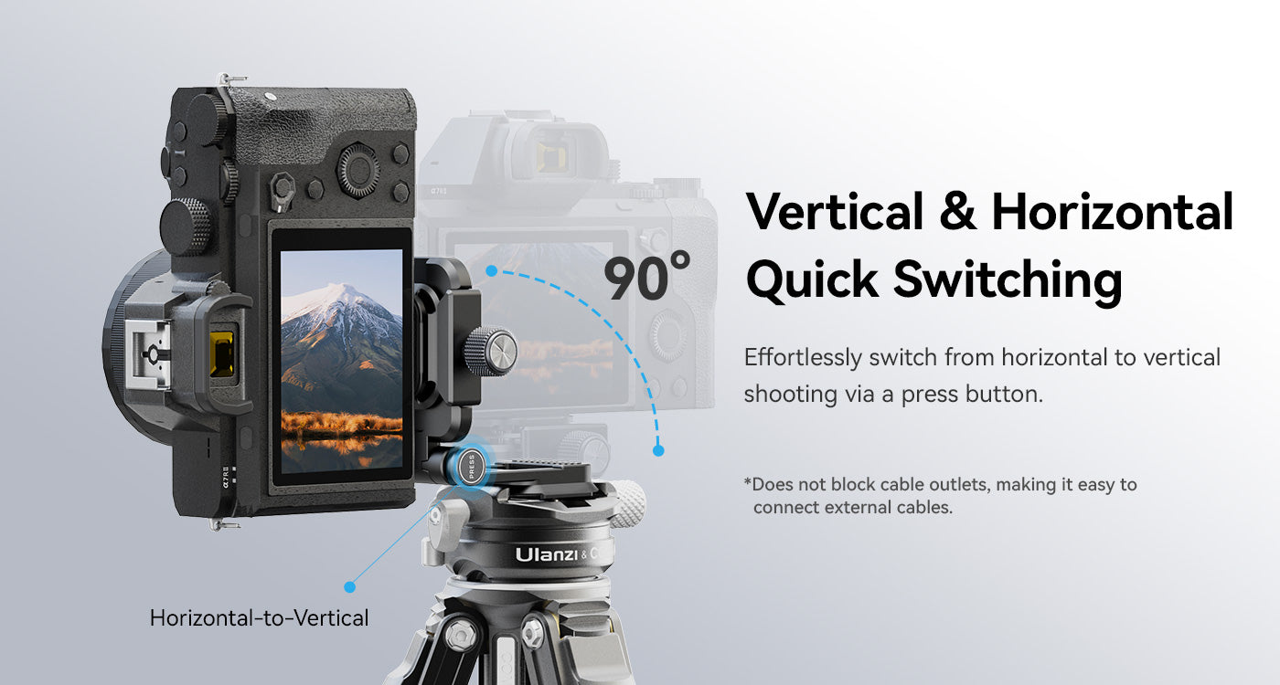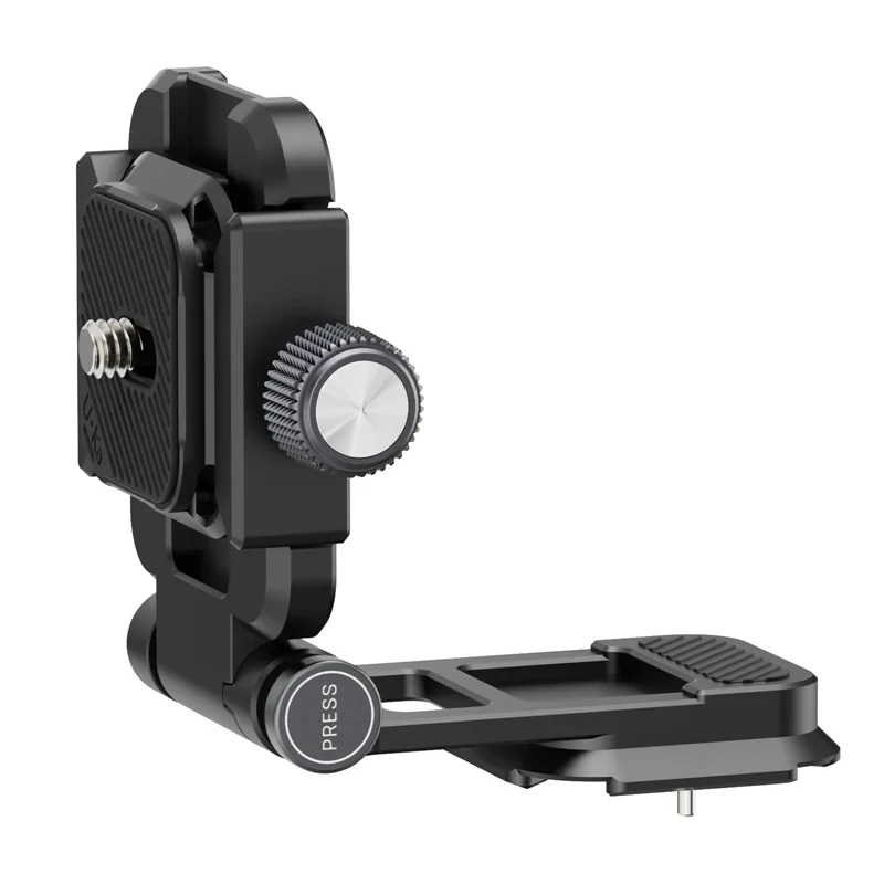 Soporte en L abatible. Cambio rápido entre la posición vertical y la horizontal. Con solo pulsar un botón, puedes cambiar fácilmente entre la orientación horizontal y la vertical. Compatible con la mayoría de placas de fijación rápida. Fácil bloqueo y desbloqueo mediante un botón giratorio.
