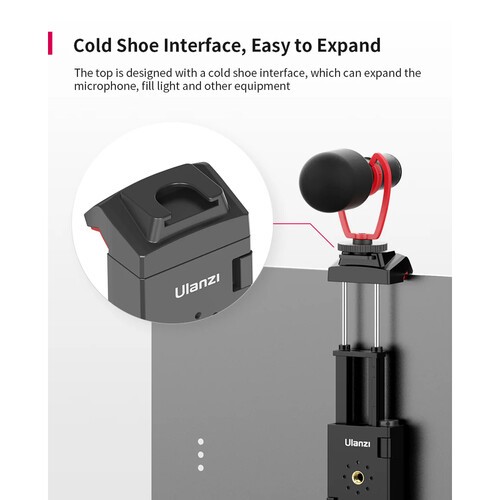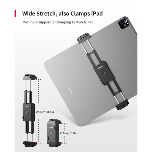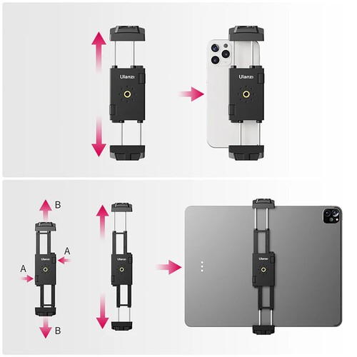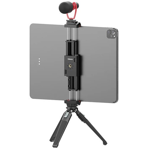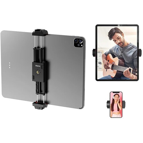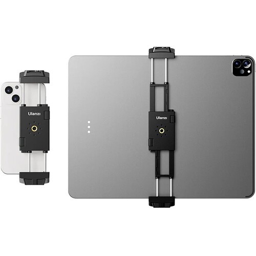 El soporte para trípode ST-29 de Ulanzi, diseñado para vlogueros, streamers, creadores de contenido creativo y otros, cuenta con una montura tipo «cold shoe» que se puede utilizar para una luz, un micrófono u otros accesorios, mientras que dos orificios roscados de 1/4"-20 permiten fijarlo a un trípode o a un palo selfie. El ST-29 es compatible con la mayoría de smartphones y tabletas, incluido el iPad Pro de 12,9", y es adecuado para dispositivos con un ancho de entre 2,63 y 8,85", pudiendo utilizarse tanto en orientación horizontal como vertical. En la parte inferior hay una ranura en la que se puede insertar el cable de carga, por lo que puedes cargar el dispositivo incluso cuando está fijado en el soporte ST-29. El paquete también incluye almohadillas de silicona que protegen contra arañazos y una almohadilla de esponja que evita que el dispositivo se deslice.