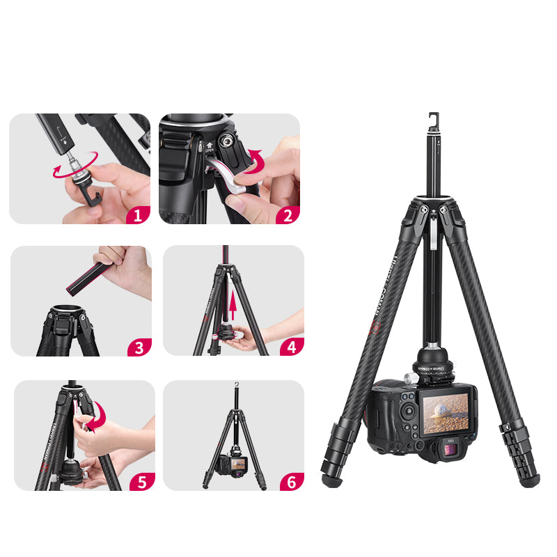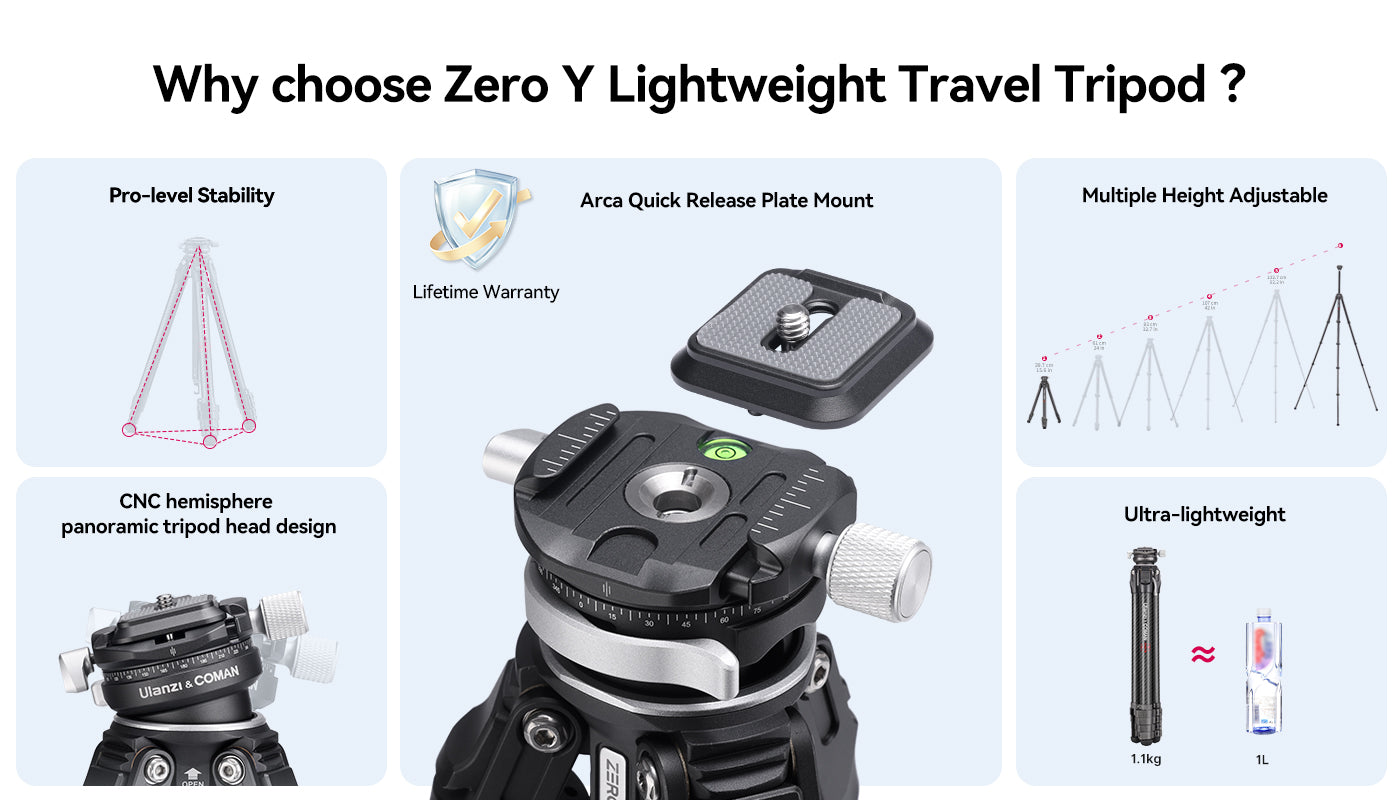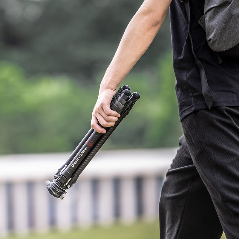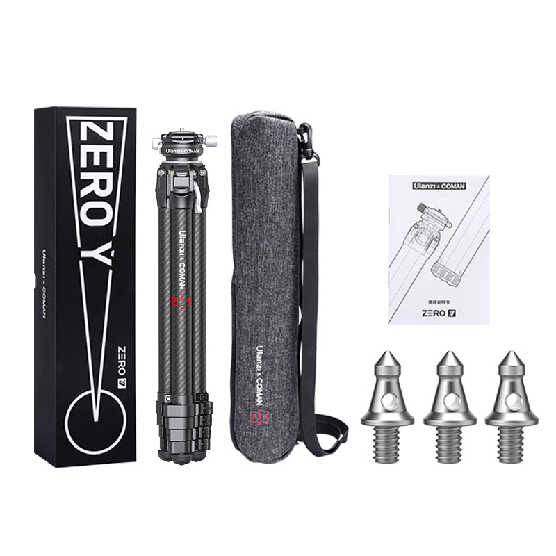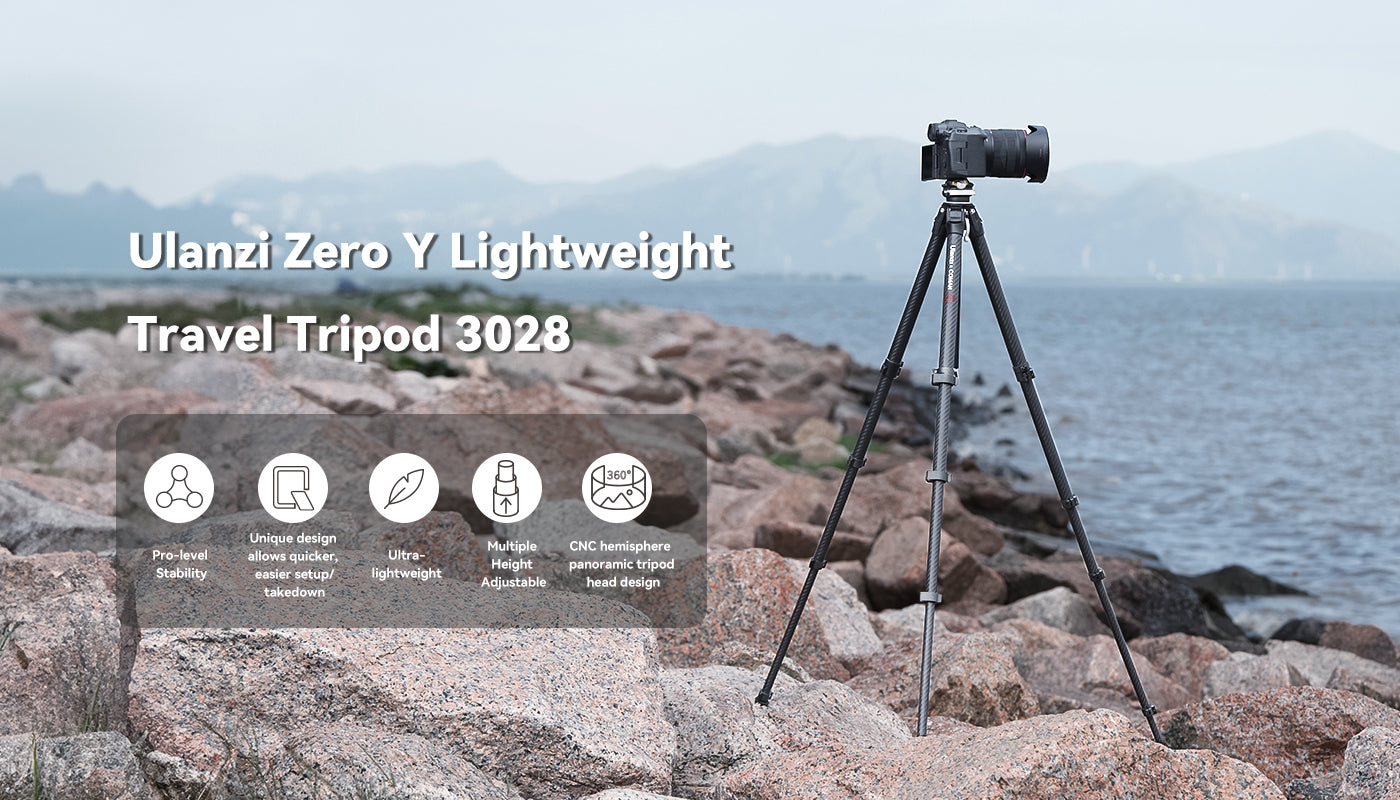 Trípode de viaje ligero Ulanzi Zero-Y de fibra de carbono 3028. Estabilidad de nivel profesional. Su diseño exclusivo permite montarlo y desmontarlo de forma más rápida y sencilla. Ultraligero. Altura ajustable. Cabezal panorámico semiesférico CNC.