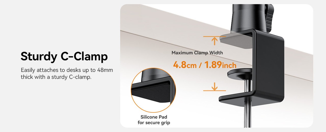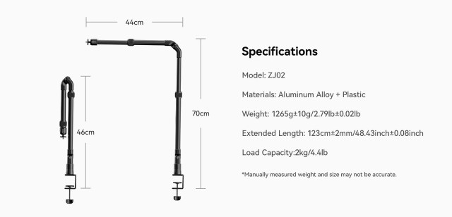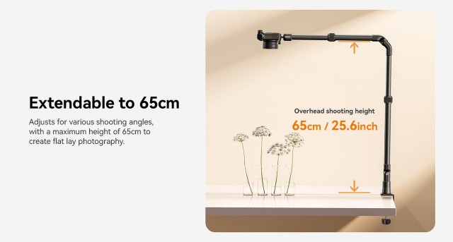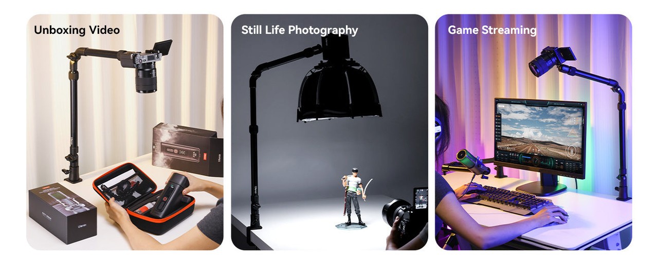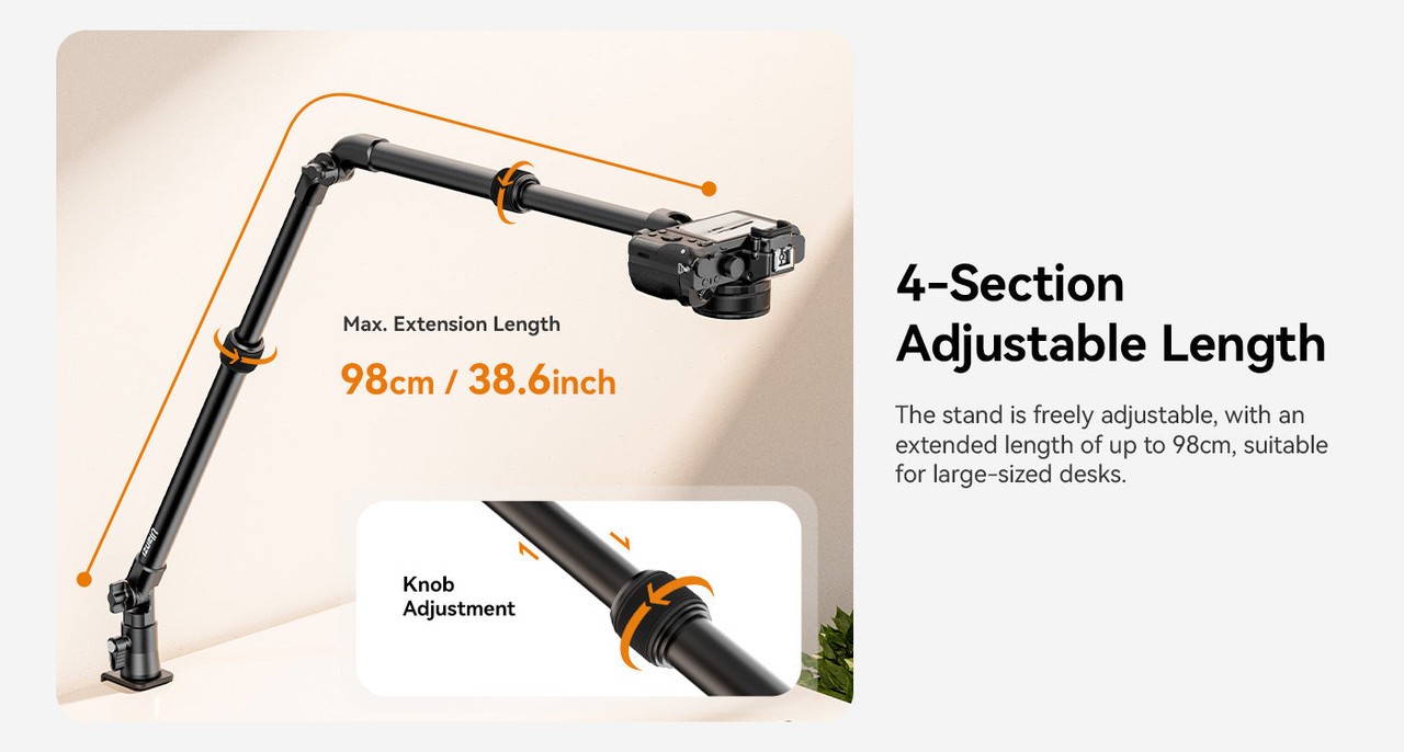El soporte abatible Ulanzi ZJ02 C-Clip es un soporte de mesa universal de aluminio con brazo flexible, ideal para tomar fotos a nivel del suelo, retransmisiones en directo o imágenes desde arriba. Es ajustable hasta una altura de 65 cm y una longitud de 123 cm, y gracias a su robusta abrazadera en C, sujeta con seguridad dispositivos de hasta 2 kg de peso.
