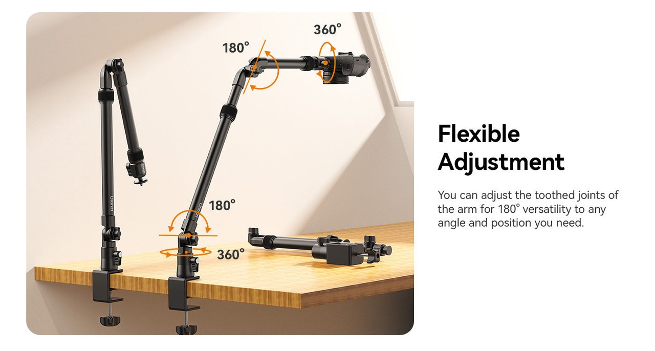 Consigue el ángulo perfecto con el soporte Ulanzi ZJ02 Camera Desk C-Clamp Mount Stand. Este soporte, diseñado para ofrecer la máxima flexibilidad, cuenta con articulaciones dentadas que permiten un ajuste de 180°, lo que ofrece una amplia variedad de posiciones para fotografiar. El brazo superior se extiende hasta 65 cm, lo que resulta ideal para fotografiar desde una superficie plana, mientras que el soporte completo se extiende hasta 123 cm para adaptarse incluso a mesas más grandes. Está fabricado en una resistente aleación de aluminio y plástico, y sostiene con seguridad dispositivos de hasta 2 kg de peso. La rótula de 1/4" permite un ajuste preciso del ángulo y la robusta abrazadera en C con almohadilla de silicona garantiza una sujeción segura en mesas de hasta 48 mm de grosor. El modelo ZJ02, ligero pero robusto, es ideal para creadores de contenido, fotógrafos y camarógrafos que buscan estabilidad y versatilidad en un solo soporte.