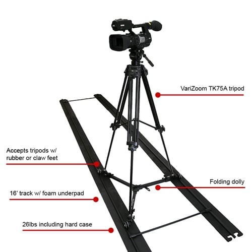 Las ruedas con superficie de goma, especialmente diseñadas, garantizan un funcionamiento totalmente silencioso, mientras que la base de espuma de alta densidad incluida permite colocar el riel prácticamente sobre cualquier superficie, incluyendo césped, grava, alfombra, baldosas y hormigón. Los soportes ajustables para fijar el trípode permiten trabajar cerca del suelo, sobre mesas de trabajo o a una altura máxima de 67 pulgadas utilizando el sistema de trípode VZ-TK75A incluido.