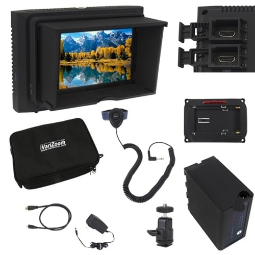 El kit VariZoom VZ-M5 (VZM5K) es una solución completa de monitorización HDMI de 5 pulgadas para producciones de vídeo profesionales. Este lujoso kit incluye el monitor VZM5 de alta nitidez, un parasol plegable, una batería Sony de la serie L de alta capacidad, un cargador, un soporte giratorio, cierres para cables HDMI, un botón de zoom remoto para ayudar a enfocar, un adaptador de corriente, dos cables HDMI y una funda de transporte blanda: todo lo necesario para un monitorizado fiable y preciso en el plató.