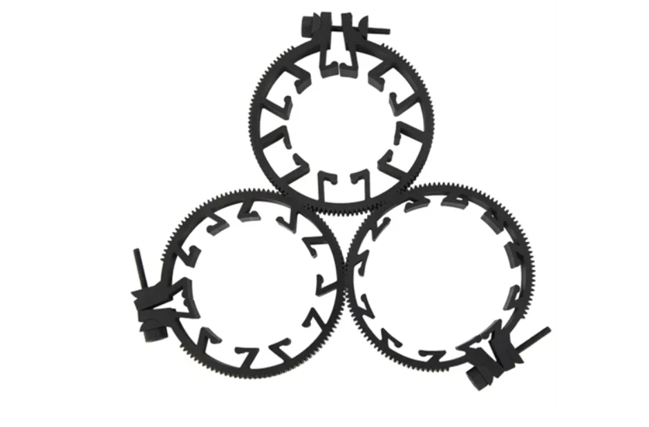 El juego de anillos dentados VariZoom VZDGS DSLR Clamp-On Gear Set ofrece una solución universal para añadir un sistema de enfoque manual a los objetivos DSLR. Estos resistentes anillos dentados se fijan de forma segura a objetivos con un diámetro de entre 60 mm y 100 mm, lo que los hace compatibles con una amplia gama de objetivos DSLR y cinematográficos.