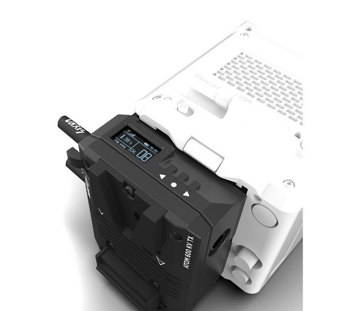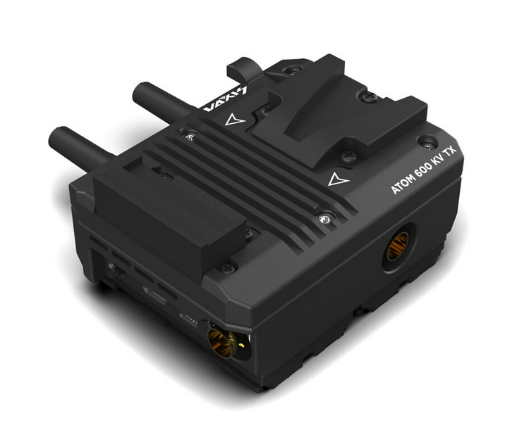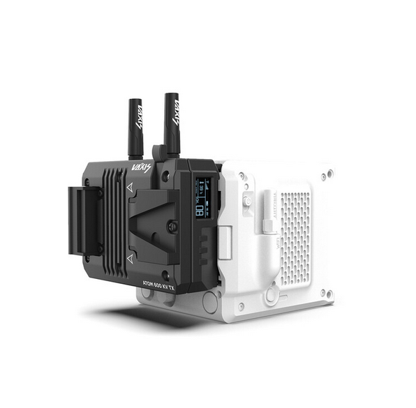 El transmisor inalámbrico Vaxis ATOM 600 KV se monta directamente en la RED KOMODO y transmite vídeo con una resolución de 1080p60 hasta una distancia de 600 pies en línea recta, con una latencia inferior a 80 ms a través de SDI/HDMI; se alimenta mediante una batería V-mount con conexión a la cámara y cuenta con multidifusión Wi-Fi a dispositivos iOS.