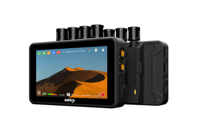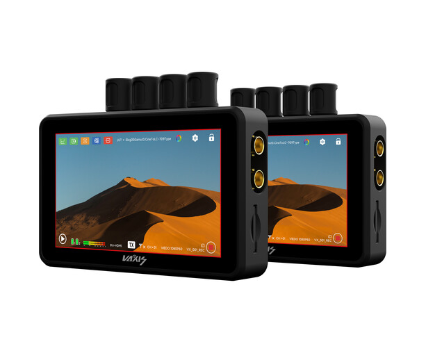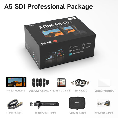 El paquete profesional Vaxis Atom A5 SDI Monitor ofrece una solución de vídeo inalámbrica completa con dos monitores táctiles TX/RX de 5,5" con una resolución de 1920 x 1080, cada uno con un brillo de 2000 cd/m², entradas/salidas SDI/HDMI con salidas en bucle, un alcance de transmisión de 300 m, grabación en MP4 en microSD, dos placas de batería L500 y herramientas CINE OS, incluyendo 3D LUT y osciloscopios, el paquete incluye nueve antenas, dos tarjetas SD de 32 GB, dos cables SDI, láminas protectoras para la pantalla, una correa para el monitor, un trípode extensible con soporte y una funda protectora de transporte.