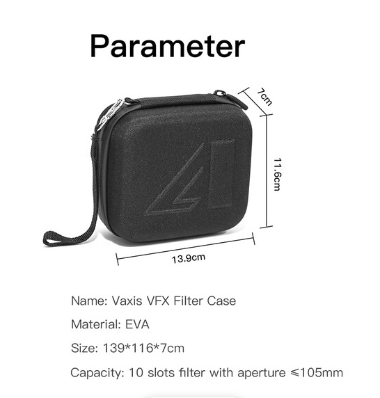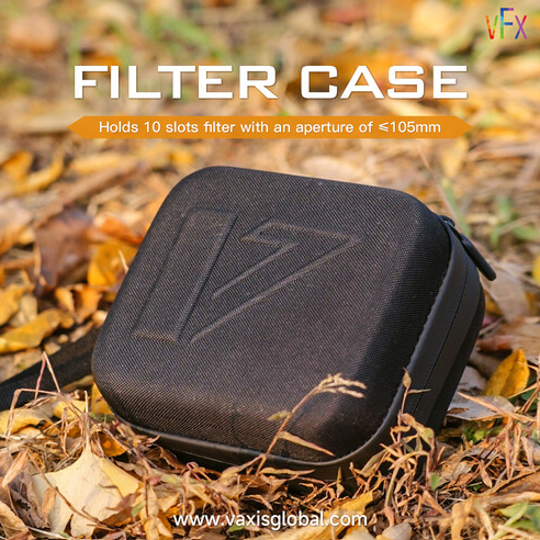 El estuche para filtros Vaxis VFX (VAR23-13) ofrece protección profesional y portabilidad para hasta diez filtros redondos de 105 mm de diámetro. Cuenta con un exterior resistente al agua y a los golpes, diez compartimentos especiales con forro de tela que protegen contra arañazos y un cierre de cremallera seguro para un fácil acceso. Con unas dimensiones de tan solo 5,5 x 4,6 x 2,8 pulgadas, este estuche ligero pero resistente es ideal para cineastas y fotógrafos que necesitan un almacenamiento organizado de sus filtros cuando viajan, y cuenta con una garantía limitada del fabricante de un año.