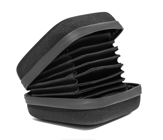 El estuche para filtros Vaxis VFX (VAR23-13) es una solución de almacenamiento compacta, impermeable y resistente de color negro que puede albergar de forma segura hasta diez filtros de 105 mm en compartimentos individuales forrados de tela para evitar arañazos. Cuenta con un cierre de cremallera fiable y una superficie exterior de tejido resistente para transportar y organizar de forma segura los filtros de cine en el plató.