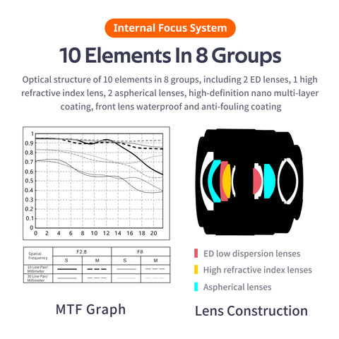 *Estructura óptica de 8 grupos y 10 elementos, incluyendo 2 lentes ED, 1 lente de alto índice de refracción y 2 lentes asféricas