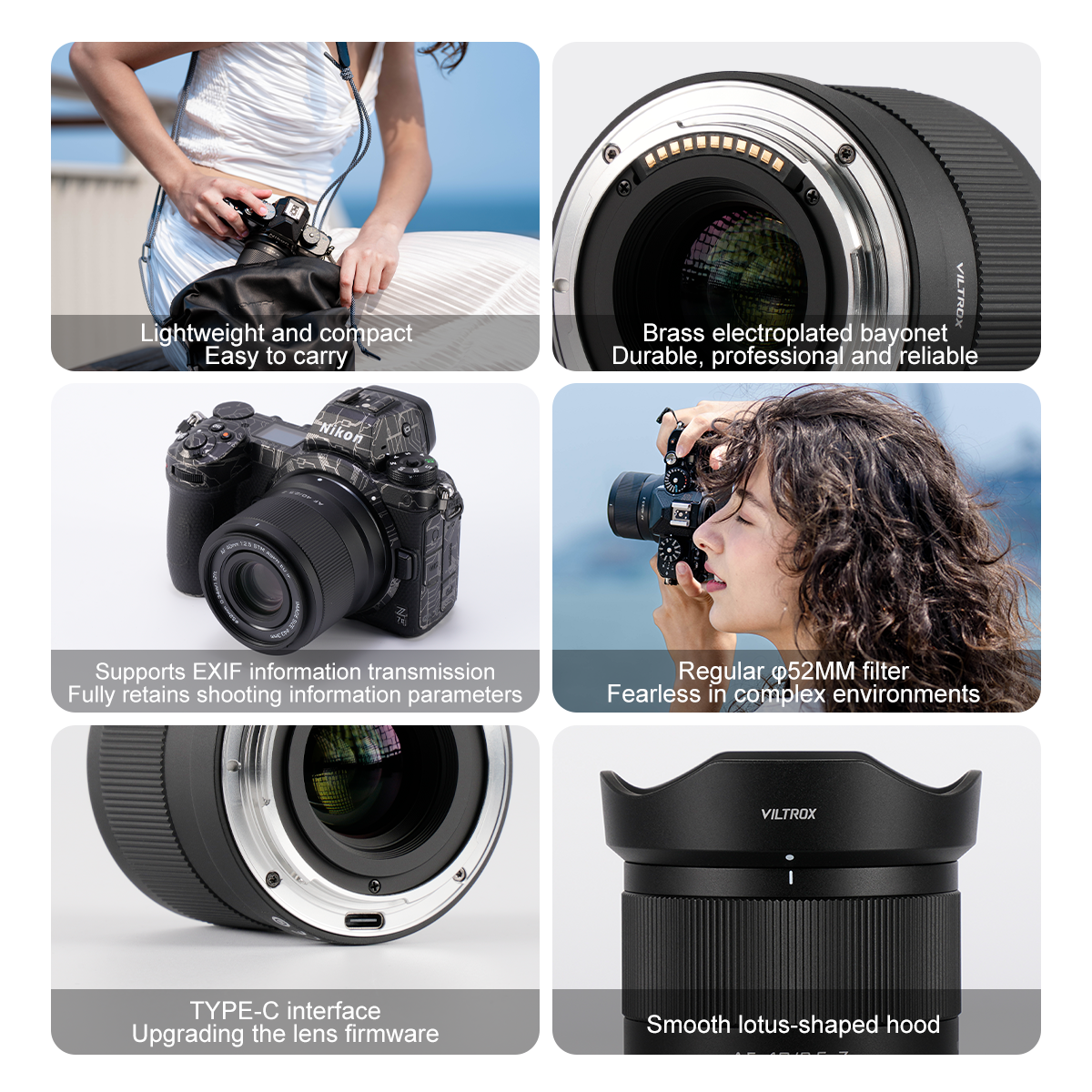 El Viltrox AF 40 mm f/2,5 es la última novedad de la gama de objetivos ligeros de formato completo Viltrox Air. Ofrece una distancia focal versátil de 40 mm, un sistema de enfoque automático rápido y preciso para capturar imágenes, así como una cobertura completa de los sensores de formato completo. El objetivo utiliza materiales especialmente ligeros que le permiten alcanzar un peso muy reducido de 180 g y destaca también por su diafragma de 7 láminas para un bonito bokeh, compatibilidad con Eye AF, un silencioso motor AF STM, optimizaciones para la grabación de vídeo, una distancia mínima de enfoque de 34 cm y una construcción óptica de alta calidad (10 elementos en 6 grupos, de los cuales 1 es ED, 3 tienen alto índice de refracción y 1 es una lente asférica), además de un tratamiento multicapa de la óptica.
