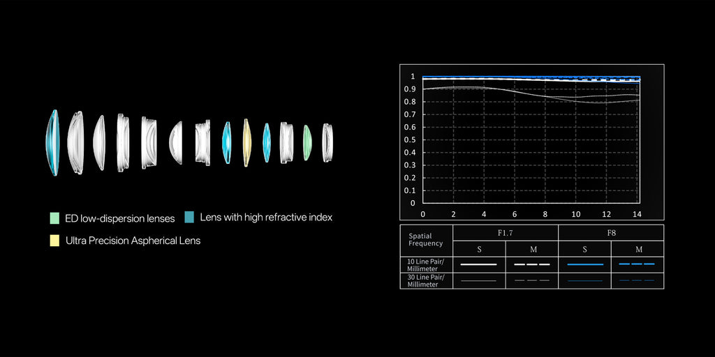 La óptica diseñada con precisión, con 13 elementos en 8 grupos, proporciona nitidez de borde a borde incluso con la apertura máxima de F1,2 y revela detalles y claridad fenomenales.
