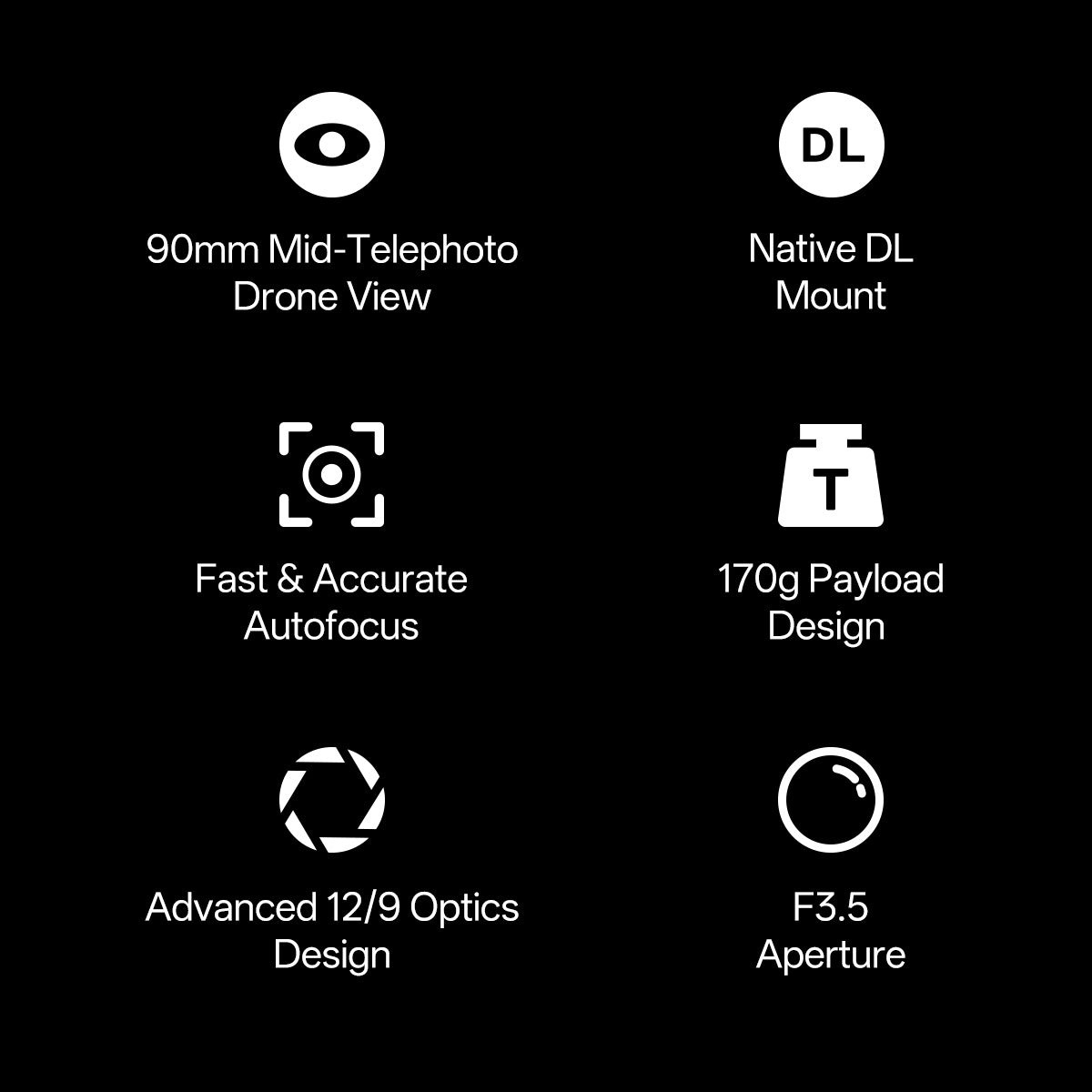 El objetivo DL AF 90 mm F3.5, gracias a su montura DLnativa, es totalmente compatible con la cámara X9-8K Air montada en el gimbal del Inspire 3 y ofrece un nuevo y potente teleobjetivo de rango medio para la fotografía aérea.