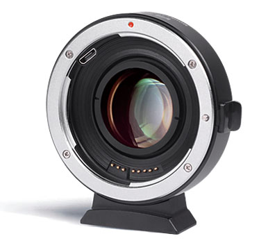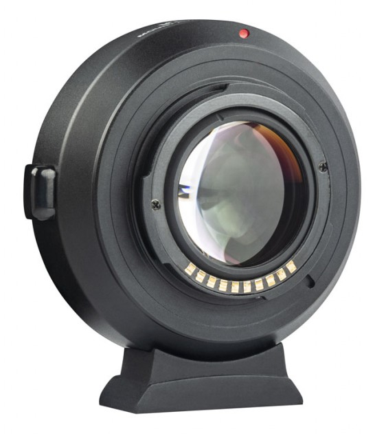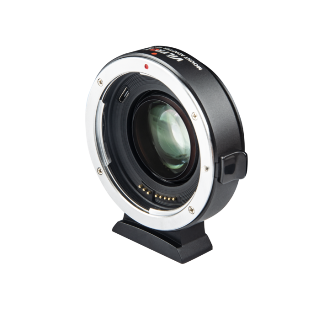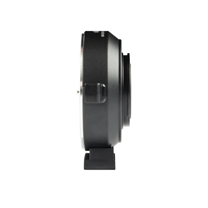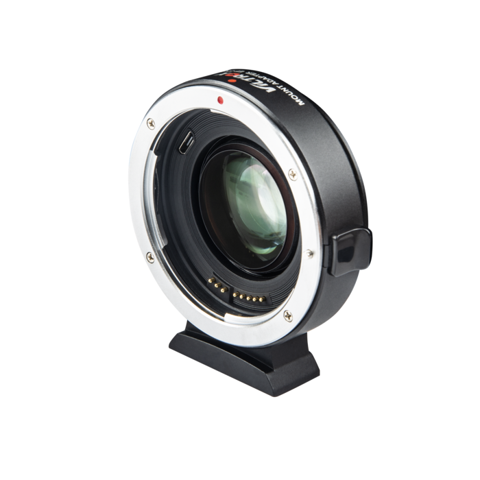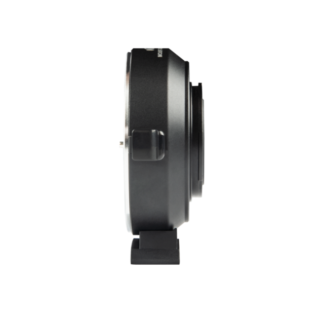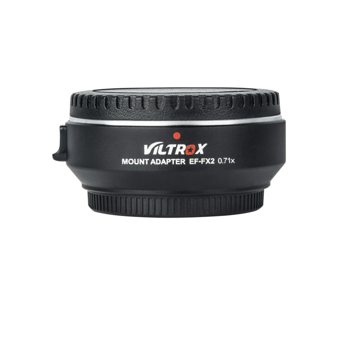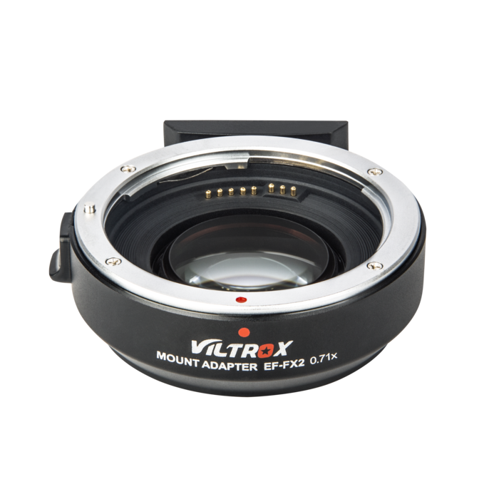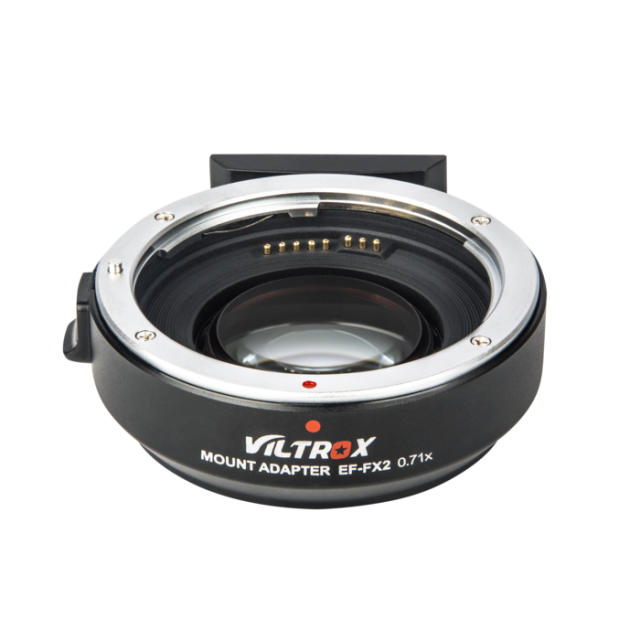 Además de adaptar mecánicamente los objetivos Canon EF a la montura X-Mount, también reduce la distancia focal (x 0,71) y aumenta la luminosidad en aproximadamente 3 EV. Los contactos eléctricos transmiten las señales para el autofoco y el diafragma, así como los metadatos EXIF; el puerto USB sirve para actualizar el firmware. La parte inferior del adaptador cuenta con una rosca de 1/4" para accesorios de montaje o trípode. Peso: 145 g; dimensiones: 68 x 27 mm.