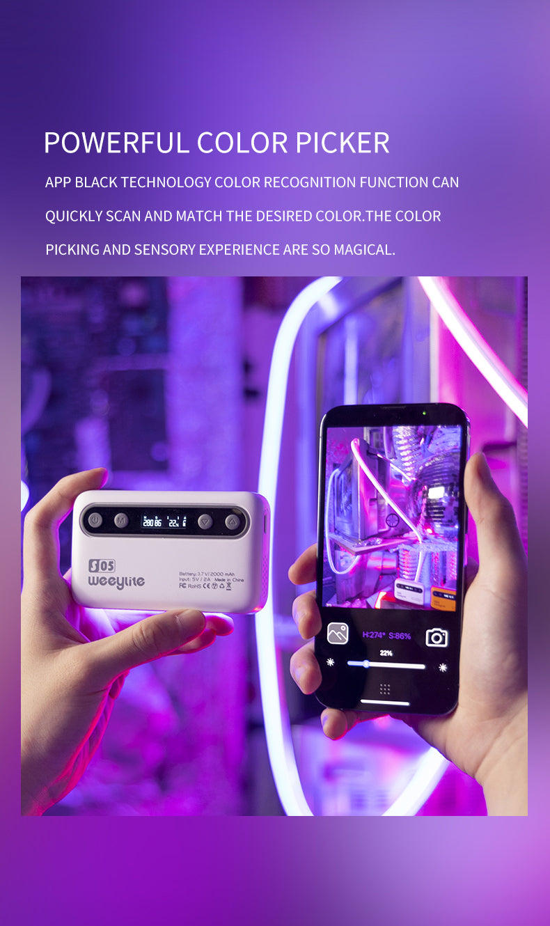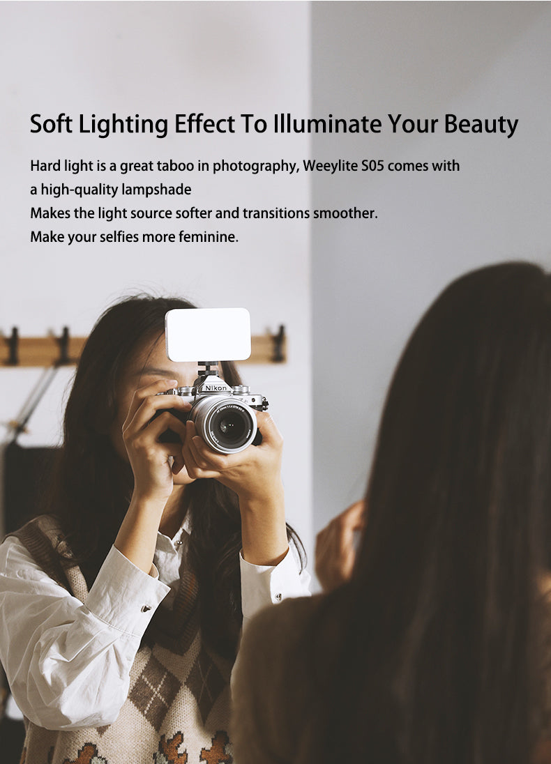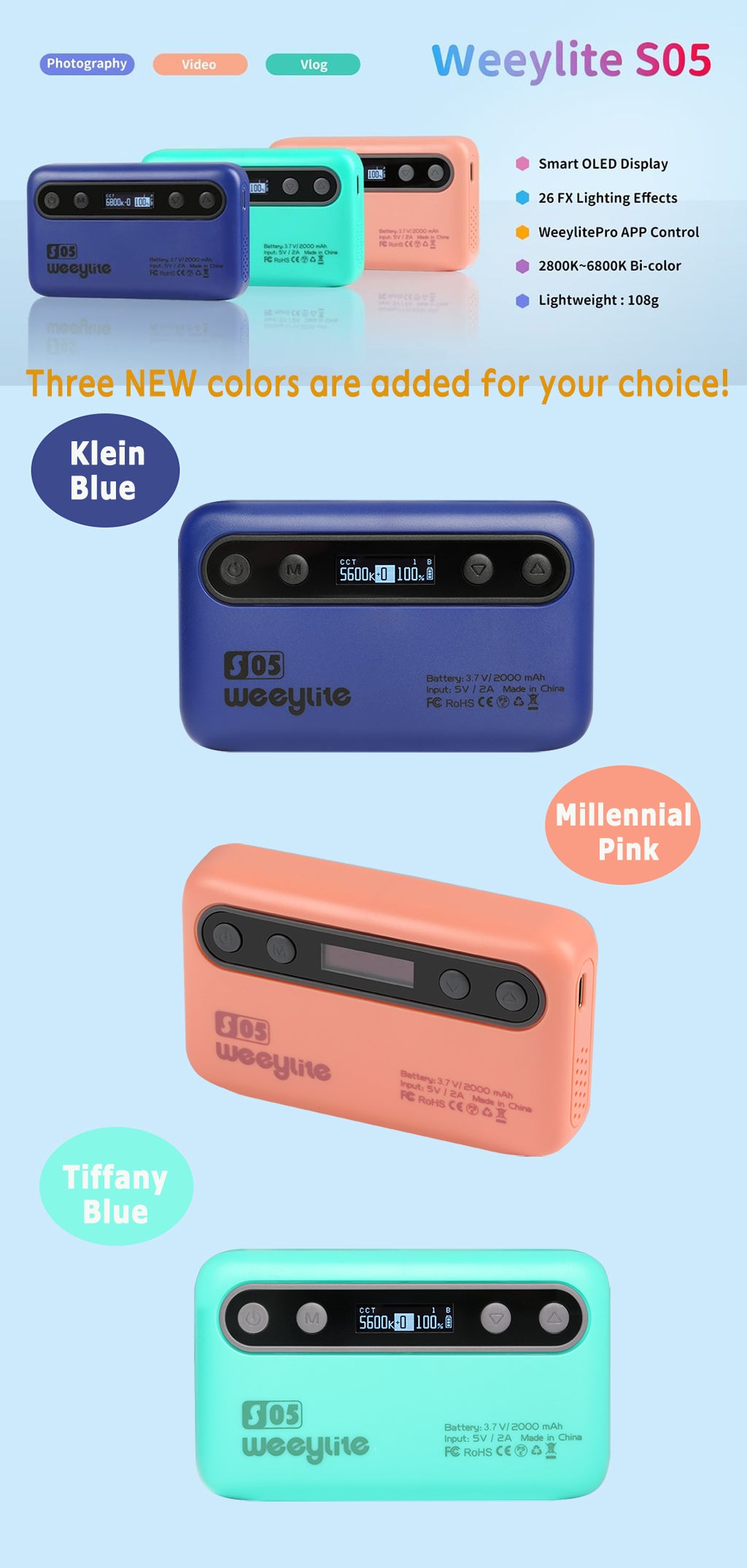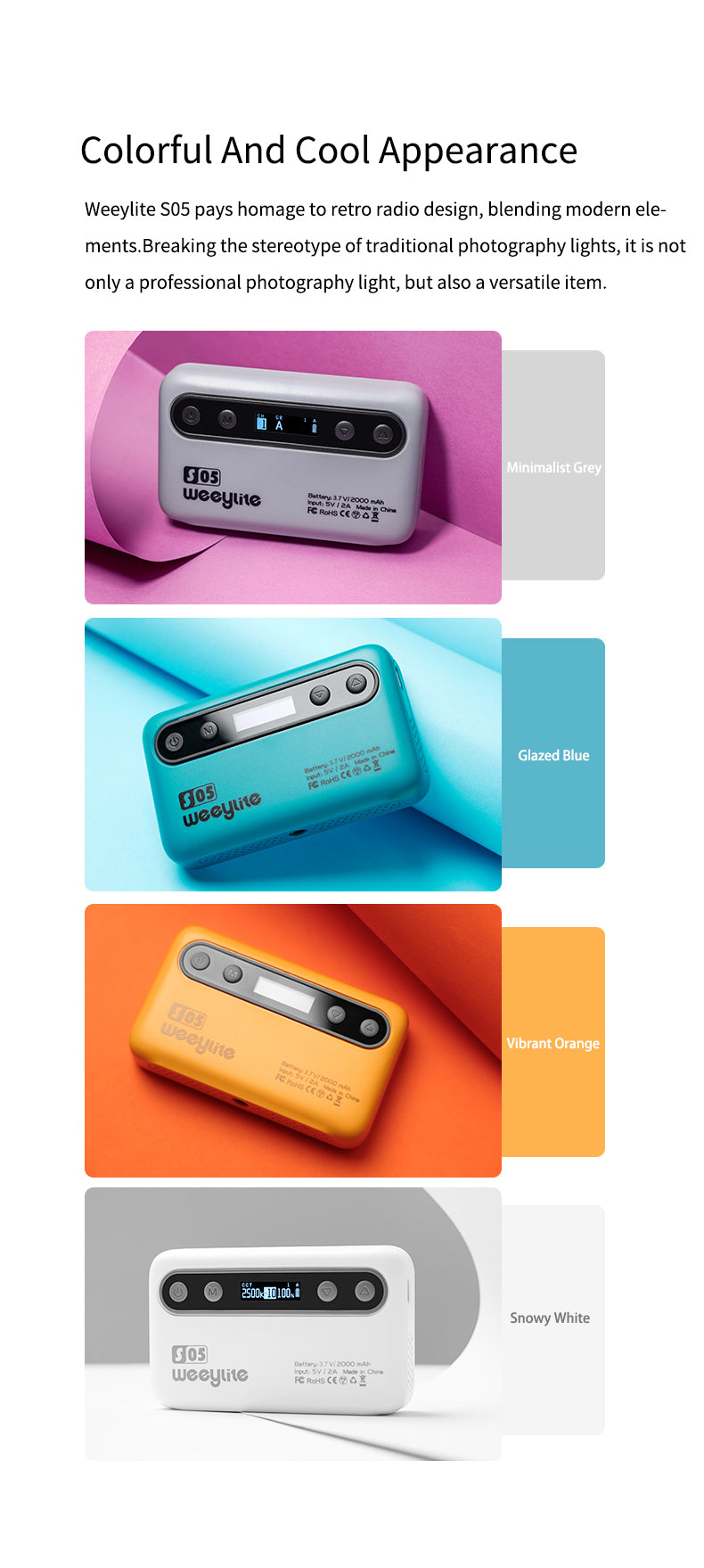 La Weeylite S05 es una luz de relleno portátil de bolsillo. Cuenta con diodos LED RGB de alta potencia (blanco positivo + blanco cálido) y de gran calidad. Destaca por su bajo consumo energético, su temperatura de color estable, su ahorro de energía y de batería, su larga vida útil, sus dimensiones compactas y su fácil transporte. La luz se puede utilizar en diversas situaciones y es ideal para fotografía, grabación de vídeos, grabación de vlogs, retransmisiones en directo, etc.