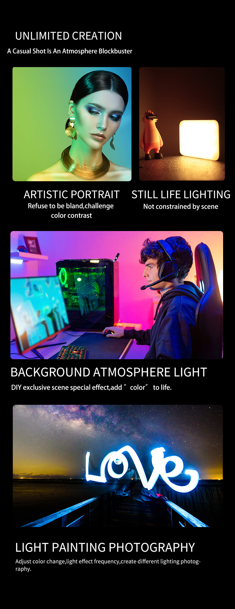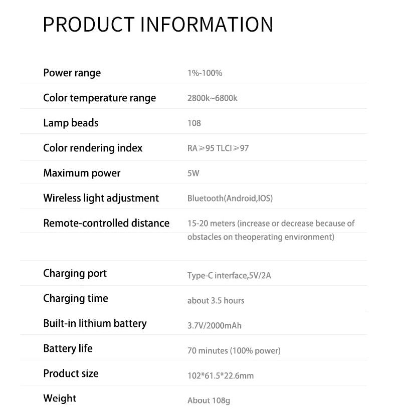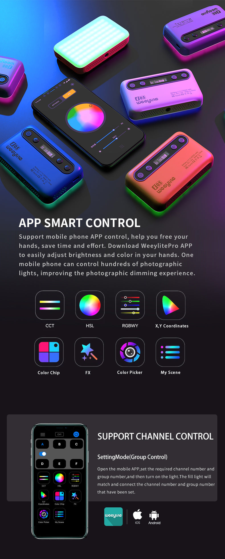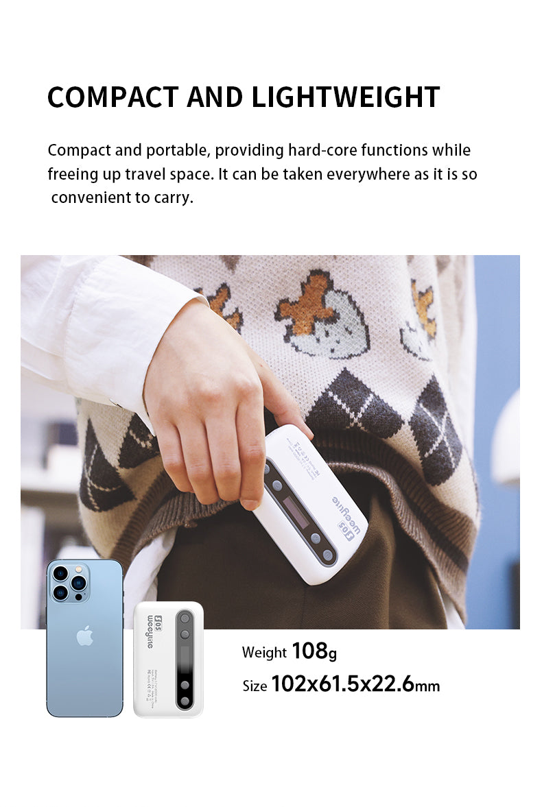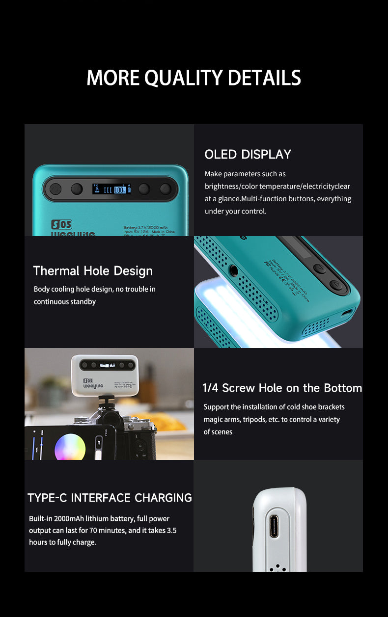 La Weeylite S05 es una luz de relleno portátil de bolsillo. Cuenta con diodos LED RGB de alta potencia (blanco positivo + blanco cálido) y de gran calidad. Destaca por su bajo consumo energético, su temperatura de color estable, su ahorro de energía y de batería, su larga vida útil, sus dimensiones compactas y su fácil transporte. La luz se puede utilizar en diversas situaciones y es ideal para fotografía, grabación de vídeos, grabación de vlogs, retransmisiones en directo, etc.