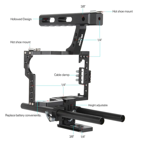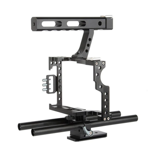 La jaula de vídeo de aleación de aluminio VX-11 es una buena opción para grabar con mayor precisión y facilidad. Cuenta con decenas de orificios estándar para tornillos de 1/4" y 3/8", así como con dos soportes de zapata, que te ayudarán a colocar fácilmente tus accesorios de vídeo. Da rienda suelta a tu creatividad.