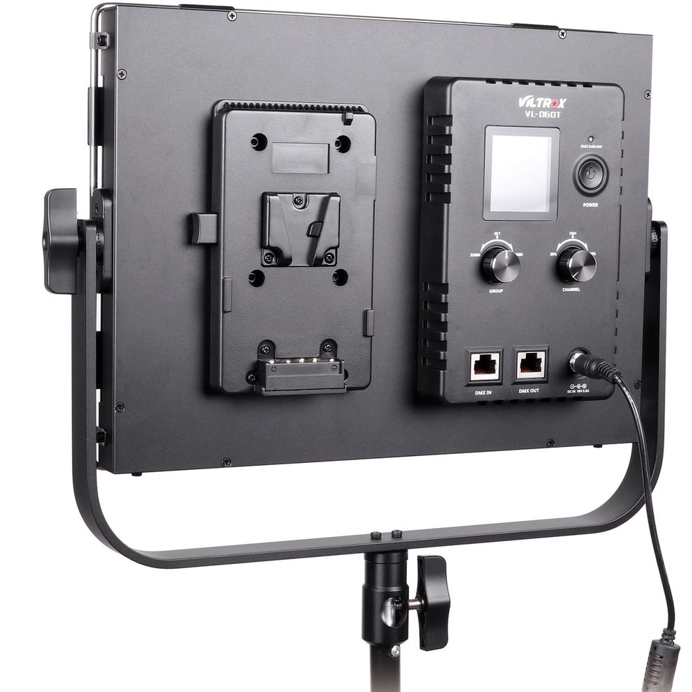 La temperatura de color y el brillo se pueden controlar localmente en la parte trasera del VL-D60T mediante controles intuitivos y una pantalla LCD, o mediante el mando a distancia inalámbrico de 2,4 GHz incluido. El mando a distancia inalámbrico tiene un alcance de hasta 65 pies y puede controlar varias luces en 19 grupos y 6 canales. Además, los puertos RJ45 de entrada y salida DMX permiten controlar los paneles a través de una conexión de red DMX.