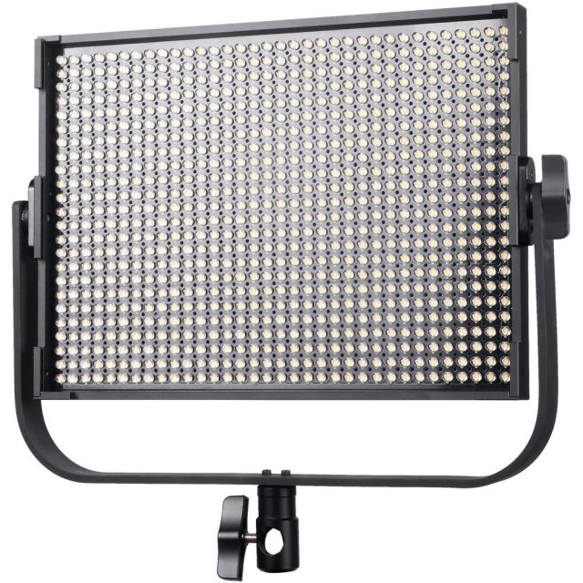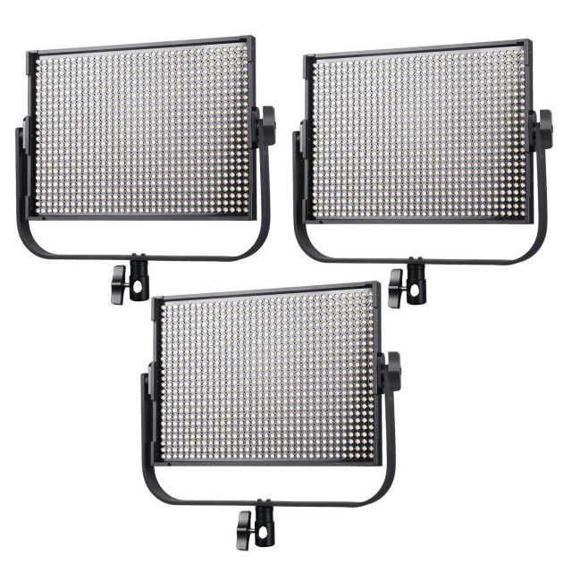 Juego de tres luces Viltrox VL-D60T. Potente luz LED bicolor de 60 W con temperatura de color ajustable (en el rango de 3300-5600 K) e intensidad regulable (20-100 %; máx. 6324 lm, 4350 lx/1 m). Ofrece la posibilidad de control remoto inalámbrico (2,4 GHz, mando incluido) y la opción de alimentación mediante baterías recargables (V-mount, batería no incluida) o fuente de alimentación externa (incluida). La configuración de los parámetros se facilita gracias a una pantalla LCD de fácil lectura. Dimensiones: 320 x 345 x 58 mm; peso: 1900 g.