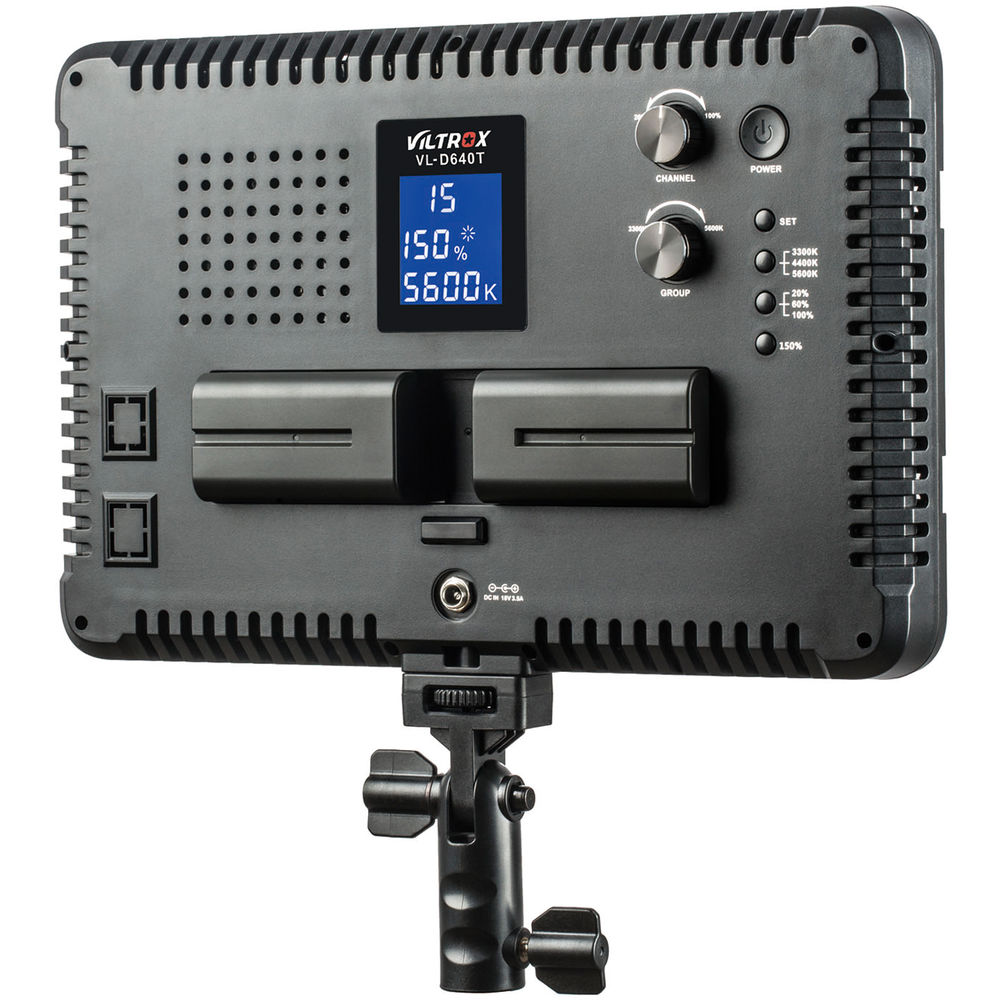 Juego de tres luces Viltrox VL-D640T. Luz LED bicolor de alta intensidad de 45 W con temperatura de color ajustable (en el rango de 3300-5600 K) e intensidad regulable (20-100 %; máx. 4800 lm, 4100 lx/1 m). Ofrece la posibilidad de control remoto inalámbrico (2,4 GHz, mando incluido) y la opción de alimentación mediante baterías recargables (NP-F550 / F570 / F960 / F970, batería no incluida) o fuente de alimentación externa (incluida en el paquete). La configuración de los parámetros se facilita gracias a una pantalla LCD de fácil lectura. Dimensiones: 286 x 190 x 32 mm; peso: 8,5 kg.