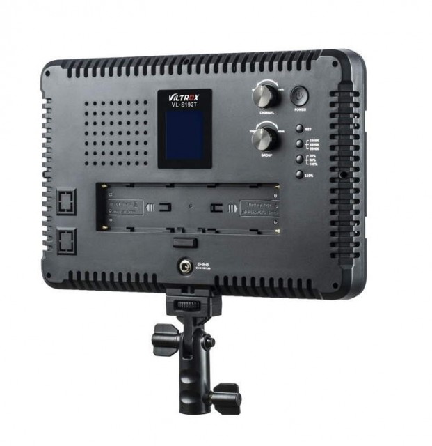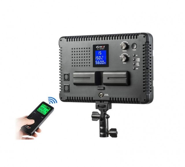 Luz Viltrox VL-S192T. Luz LED bicolor de alta intensidad de 45 W con temperatura de color ajustable (en un rango de 3300 a 5600 K) e intensidad regulable (20-100 %; máx. 4700 lm, 3500 lx/1 m). Ofrece la posibilidad de control remoto inalámbrico (2,4 GHz, el mando a distancia se incluye en el suministro) y la opción de alimentación mediante baterías (NP-F550 / F570 / F960 / F970, las baterías no se incluyen en el suministro) o una fuente de alimentación externa (se incluye en el suministro). La configuración de los parámetros se facilita gracias a una pantalla LCD clara. Dimensiones: 286 x 190 x 32 mm; peso: 770 g. Tenga en cuenta que para su funcionamiento es necesario un cable de alimentación de corriente continua o dos baterías.