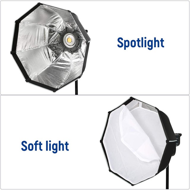 Softbox para el flash LED Viltrox Weeylite Ninja 400 (y otros con montura Bowens, como el Sokani x60, el Godox SL-60W, el VL150 o el Aputure 1202). Diámetro: 65 cm; profundidad: 41 cm. El paquete incluye una bolsa de transporte.
