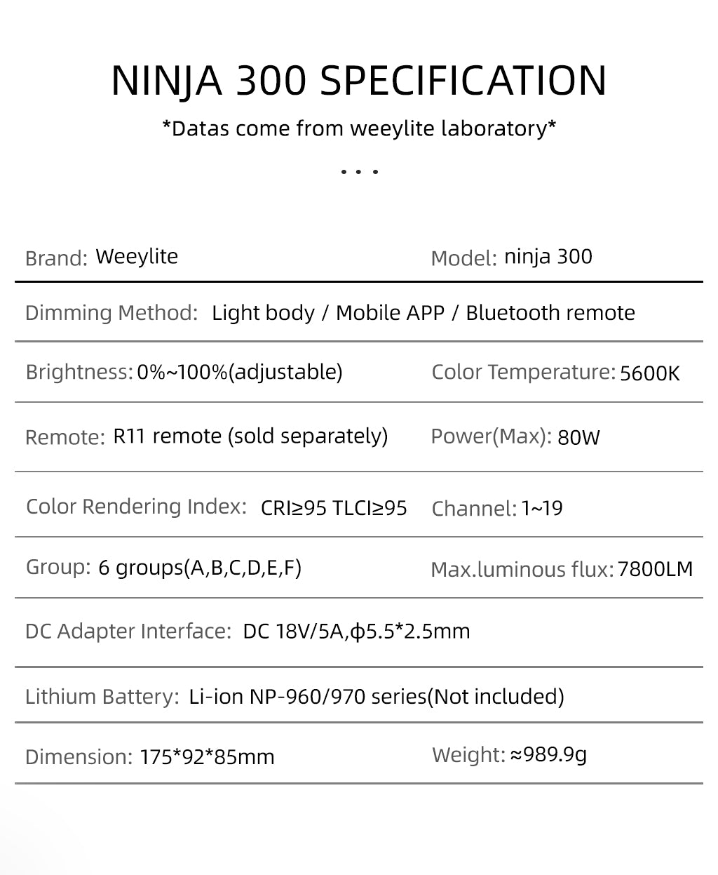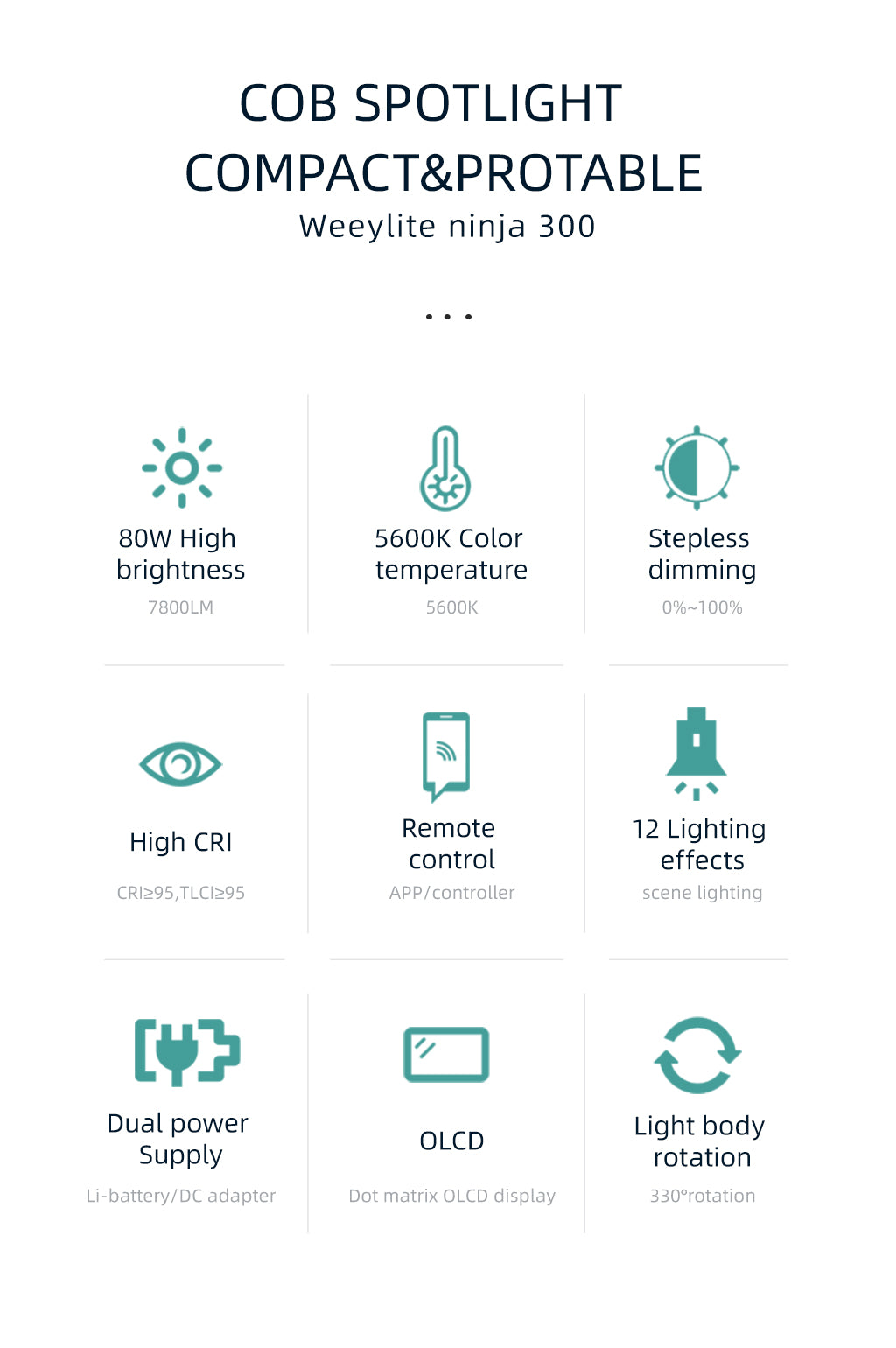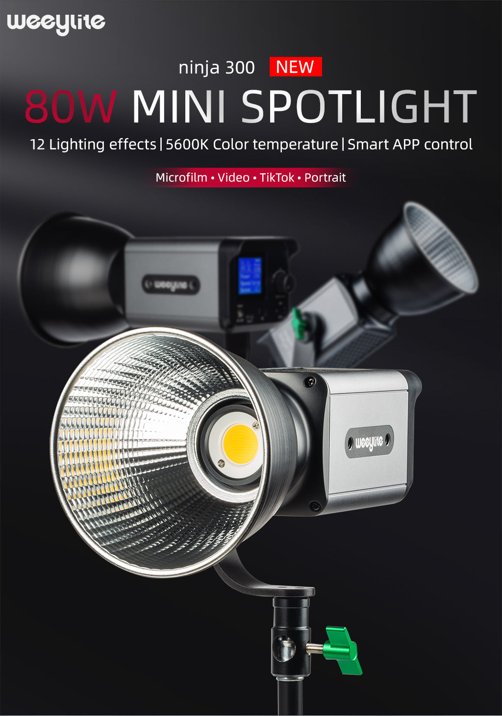 La Weeylite Ninja 300 es una pequeña y potente luz LED COB. Incorpora elementos LED COB con un alto índice CRI y gran potencia. Es la herramienta ideal para fotografía y rodajes de estudio, exposiciones, estudios de maquillaje y otras aplicaciones en las que se requiere una fuente de luz de calidad.