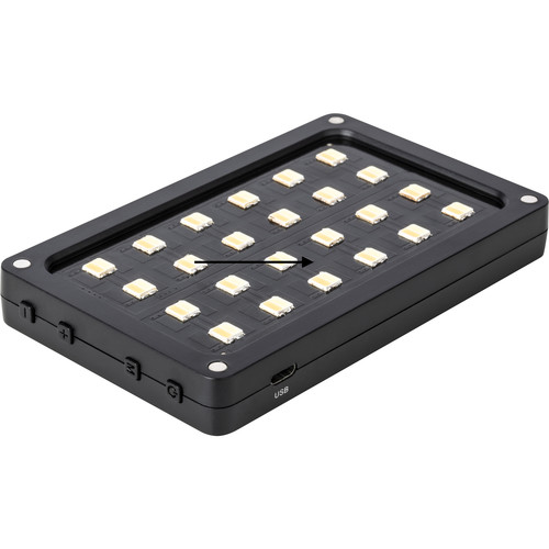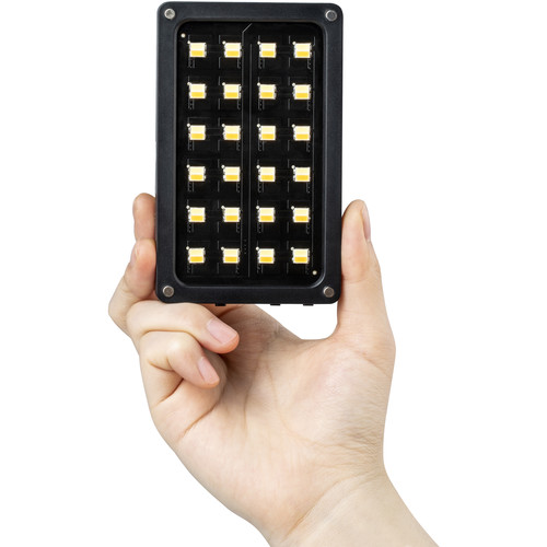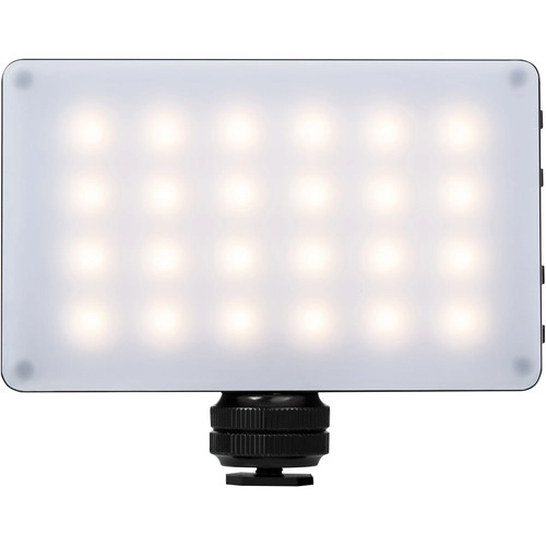 Luz LED para cámara con 24 diodos LED bicolores con una temperatura de color en el rango de 2.500–8.500 K y batería integrada (se carga mediante interfaz Micro USB; no se puede utilizar la luz durante la carga; autonomía de aprox. 1,2 h al 100 % de intensidad y con una temperatura de color de 5.600 K). La pantalla OLED integrada muestra la temperatura de color, el brillo (regulable entre el 10 % y el 100 % sin parpadeos) y el estado de la batería. Por supuesto, incluye una rosca de 1/4"-20 y un adaptador para zapata de flash, así como un difusor.