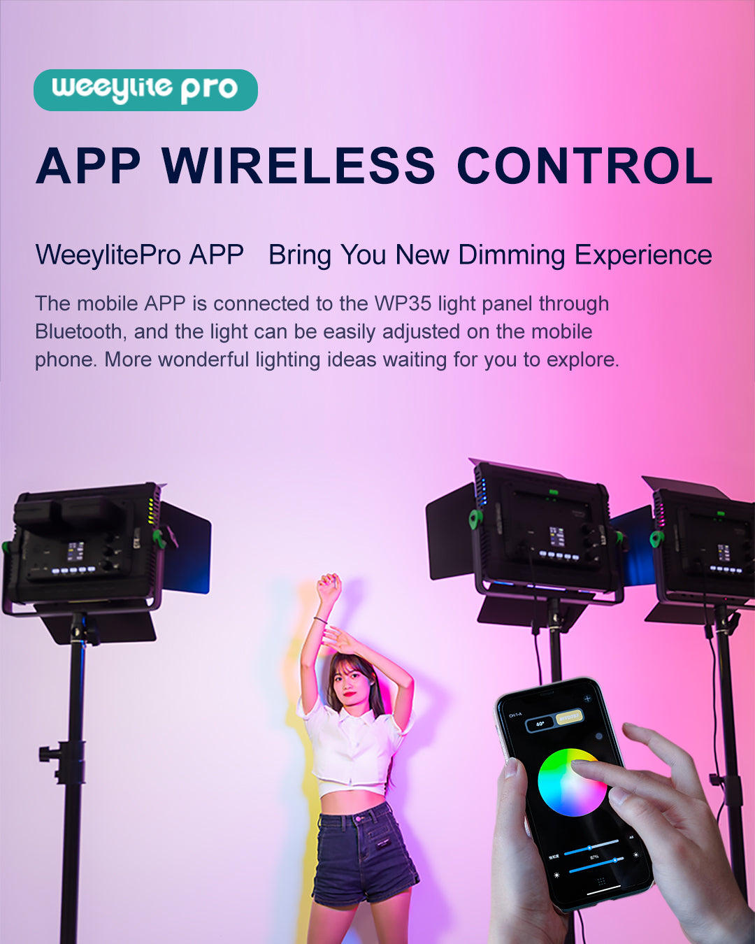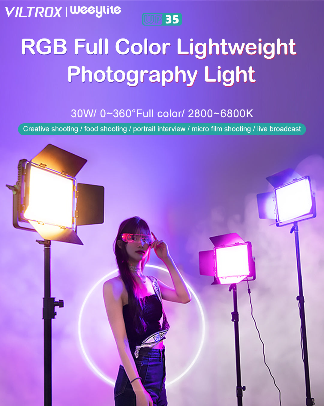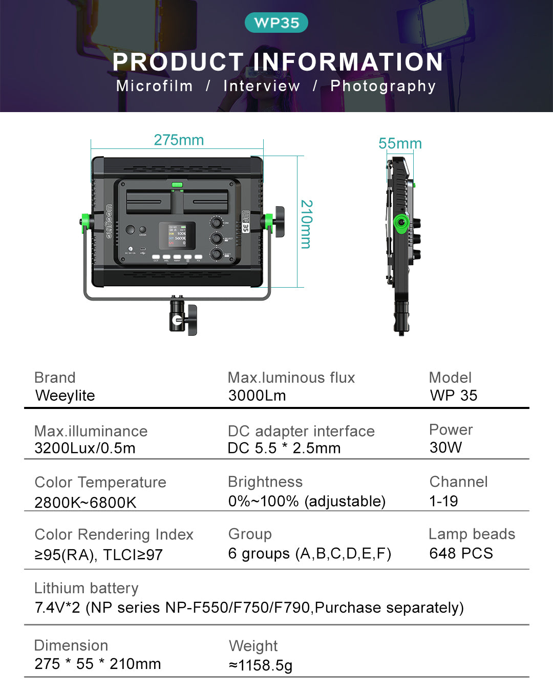 El WP35 es una luz de relleno fotográfica profesional con lámparas de alta calidad, un índice de reproducción cromática elevado y RGB optimizado, bajo consumo energético, temperatura de color estable y una relación entre temperatura de color y luminosidad que se puede ajustar a voluntad. Es fácil de transportar y resulta ideal para fotografiar en diversos escenarios, por lo que puede satisfacer tus necesidades fotográficas y de grabación en múltiples situaciones.