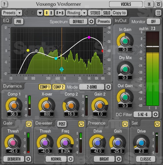 Voxengo Voxformer es un plug-in de audio vocal especializado (interfaces AAX, AU y VST) para el procesamiento profesional de grabaciones de la voz humana en aplicaciones de edición de audio y vídeo (que admitan el estándar VST, como Grass Valley EDIUS!). El plug-in es compatible con los sistemas Windows y Mac OS X y con las aplicaciones Cubase, Logic Pro, Ableton Live, ProTools, Reaper, Cakewalk Sonar, Presonus Studio One, Nuendo, WaveLab, GarageBand, FL Studio, Sony Vegas, Sound Forge, Adobe Audition, Samplitude, Digital Performer, Mixcraft, Bitwig Studio y EDIUS. Solo distribución digital.